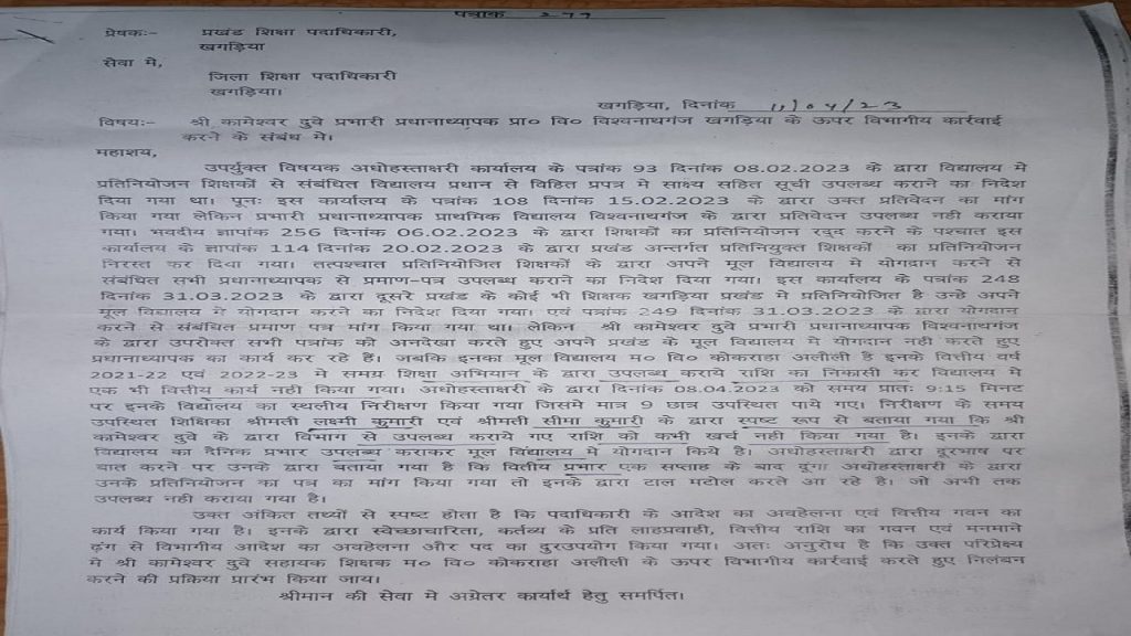 बीईओ द्वारा निलंबन व विभागीय कार्रवाई की अनुशंसा के पत्र के आलोक में मध्य विद्यालय कोकराहा के सहायक शिक्षक कामेश्वर दूबे से स्पष्टीकरण पूछते हुए तीन दिनों के अंदर जवाब मांगा गया है.