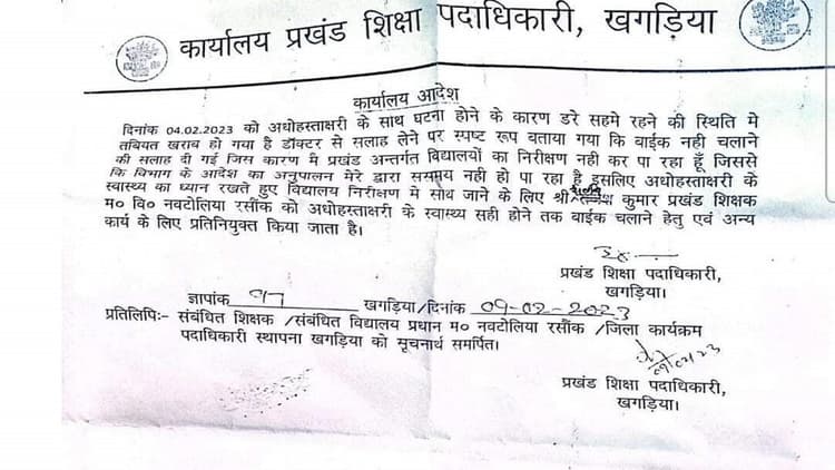 बिहार के खगड़िया में शिक्षकों से जुड़ा विवाद थमने का नाम नहीं ले रहा है. प्रखंड शिक्षा पदाधिकारी ( बीईओ) खुद विवाद में उलझ गए हैं. मामला शिक्षक को अपना ड्राइवर बनाने से जुड़े एक पत्र का है. जिसमें बीईओ ने आदेश जारी किया है कि उनकी बिगड़ी सेहत को देखते हुए एक शिक्षक को बाइक चलाकर उन्हें स्कूल ले जाने की जिम्मेवारी सौंपी जाती है.