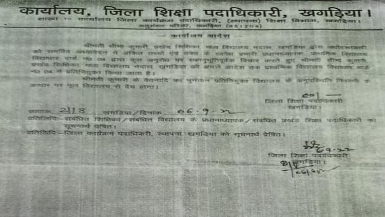 Bihar News: डीईओ से प्रतिनियोजन करवा कर गुजरात में रह रही सहायक शिक्षिका का खगड़िया के एक विद्यालय में हाजिरी बनती रही, हर महीने शिक्षिका को उपस्थित दिखा कर ऐबसेंटी भेजकर वेतन भुगतान होने का सनसनीखेज मामला प्रकाश में आया है. यह खेल सितंबर 2022 से चल रहा था, इसी बीच बीईओ राम उदय महतो के द्वारा विद्यालय के निरीक्षण के दौरान पूरी पोल खुल गयी.
