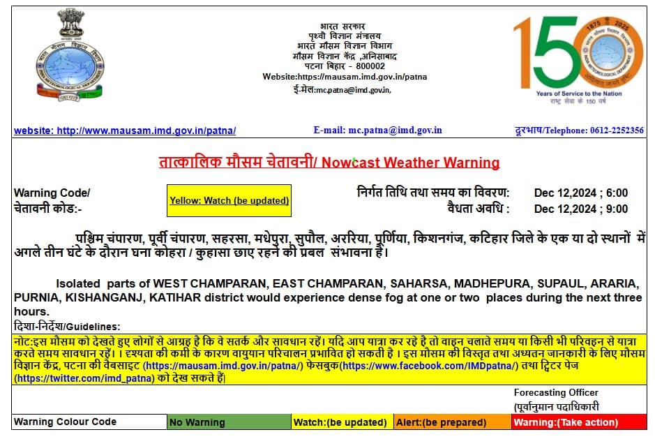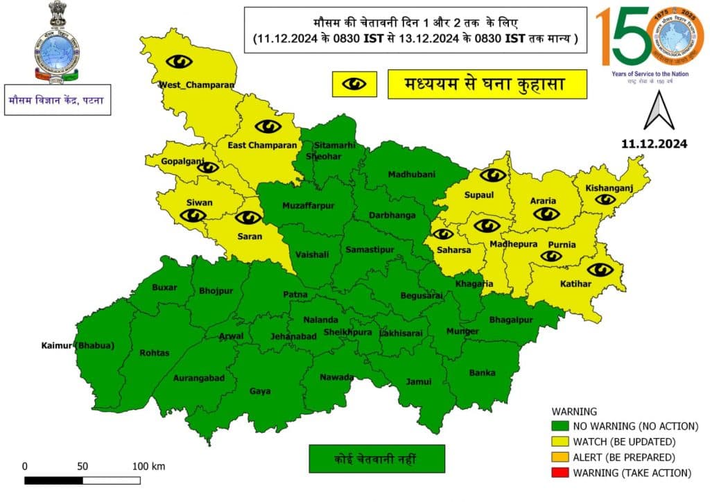 पटना मौसम विज्ञान केंद्र ने 12 जिलों में घने कोहरे की चेतावनी जारी की है. इन जिलों में पश्चिम चंपारण, पूर्वी चंपारण, गोपालगंज, सीवान, सारण, सुपौल, सहरसा, मधेपुरा, अररिया, किशनगंज, पुर्णिया और कटिहार शामिल हैं. मौसम विभाग ने आने वाले दिनों में तापमान में तेजी से गिरावट होने की संभावना जताई है.