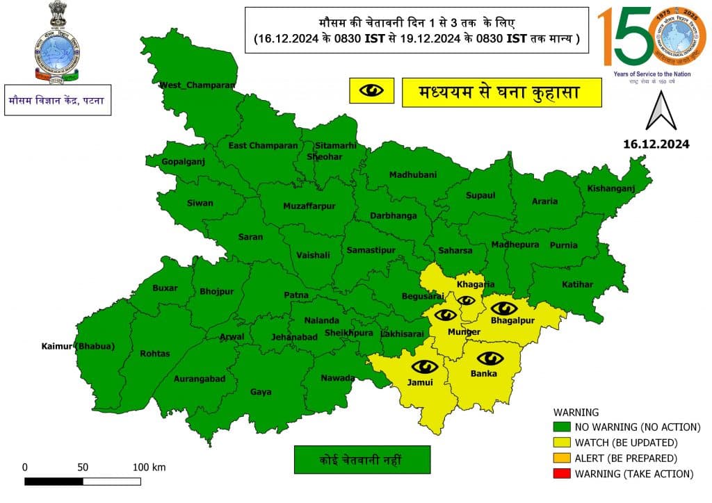 कोहरे की बात करें तो पश्चिमी चंपारण, सारण, सीवान, बक्सर, पटना, मुजफ्फरपुर, वैशाली, दरभंगा, खगड़िया, बेगुसराय, समस्तीपुर, मधेपुरा, जमुई, भागलपुर और किशनगंज जिलों के के भागों में देर रात और सुबह के समय मध्यम से घना कोहरा छाया हुआ है. यह स्थिति कल भी रहने की संभावना है. इसको लेकर येलो अलर्ट जारी किया गया है.