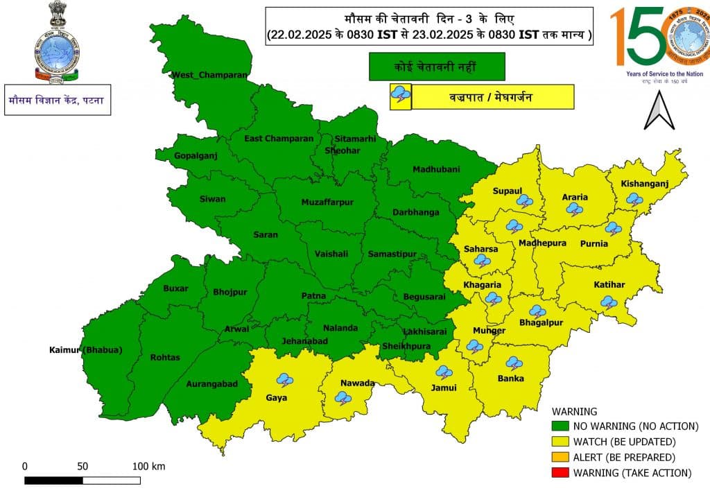 22 फरवरी को बिहार के सुपौल, अररिया, किशनगंज, सहरसा, मधेपुरा, पूर्णिया, कटिहार, भागलपुर, खगड़िया, बांका, जमुई, मुंगेर, गया और नवादा में बारिश होने की संभावना है. किसानों को सतर्क रहने और मौसम की ताजा जानकारी पर नजर बनाए रखने की सलाह दी गई है.