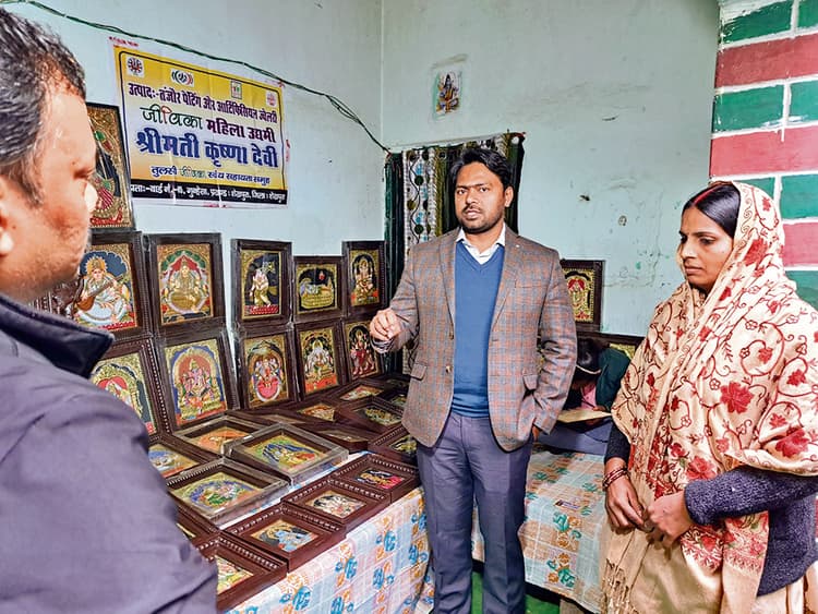 शेखपुरा. जिले के सदर प्रखंड अंतर्गत गुन्हेशा गांव की रहने वाली कृष्णा देवी जो तंजौर कलाकृतियों का निर्माण कर समाज में अपनी एक अच्छी पहचान बना चुकी हैं. जिनकी प्रतिभा को देखने के लिये डीएम आरिफ अहसन उनके घर पहुंचे.तुलसी जीविका स्वयं सहायता समूह से जुडी कृष्णा देवी वर्ष 2022 से जीविका की मदद से राज्य एवं राज्य के बाहर अनेक प्रकार के सरस एवं आजीविका मेले में भाग ले रही हैं.पटना स्थित गांधी मैदान एवं ज्ञान भवन में आयोजित सरस मेला से इन्होंने शुरुआत की फिर रांची, नोएडा, भुवनेश्वर, गुरुग्राम इत्यादि बड़े-बड़े स्थानों पर जीविका की ओर से इन्हें अपनी कलाकृति को प्रदर्शित करने का अवसर मिला.इनकी प्रतिभा को देखने पहुंचे डीएम ने कृष्णा दीदी द्वारा तैयार किये कलाकृतियों को देख काफी सराहना की. पेंटिंग तैयार करने हेतु पर्याप्त स्थान की कमी को ध्यान में रखते हुए सम्बंधित पदाधिकारी को इन्हें उचित स्थान उपलब्ध कराने को निर्देशित किया. पंचायत में जीविका भवन का निर्माण कर जीविका दीदियों को सुपुर्द करवाएं जहां समूह और ग्राम संगठनों की बैठक के साथ-साथ इस प्रकार की जीविकोपार्जन गतिविधियाँ की जा सके.इस अवसर पर कृष्णा दीदी ने डीएम साहब को सम्मानित करते हुए अपने हाथों से बनायीं गयी एक कलाकृति भेंट की और धन्यवाद किया. कृष्णा दीदी द्वारा इस कला निर्माण में रूचि रखने वाली गांव की महिलाओं और छोटी-छोटी प्रतिभाशाली बच्चियों को भी प्रशिक्षण दिया जा रहा है जो काफी प्रेरणादायक है.