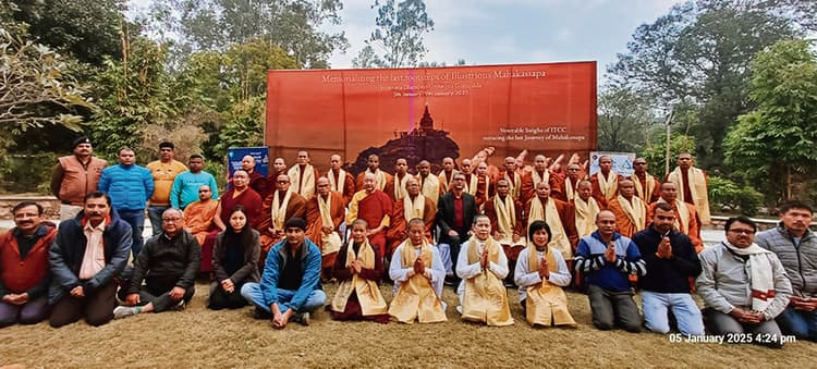 राजगीर. नव नालंदा महाविहार, नालंदा तथा लाइट ऑफ बुद्ध धर्म फाउंडेशन इंटरनेशनल के सहयोग से “मेमोरियलाइजिंग द लास्ट फुटस्टेप्स ऑफ इलस्ट्रियस महाकस्सप ” पद यात्रा का आयोजन किया गया है. बुद्ध के एक प्रमुख शिष्य, महाकश्यप की विरासत को यादगार बनाने के लिए एक महत्वपूर्ण हेरिटेज पद यात्रा का आयोजन किया गया है. दक्षिण पूर्व एशियाई देशों के 30 से अधिक बौद्ध भिक्षु पांच से नौ जनवरी तक यह यात्रा होगी. राजगीर के वेणुवन से गया जिले के गुरपा तक महाकश्यप की अंतिम यात्रा के मार्ग पर निकलेंगे. रविवार को वेणुवन, राजगीर में इस ऐतिहासिक कार्यक्रम में भाग लेने वाले भिक्षुओं को सम्मानित किया गया. इस कार्यक्रम में प्रो. सिद्धार्थ सिंह कुलपति तथा प्रो. दीपंकर लामा, कुलसचिव, नव नालंदा महाविहार, नालंदा के अलावे सुश्री वांग्मो डिक्सी, एवं दीपक आनंद के साथ कई अन्य प्रमुख लोग भी शामिल हुये हैं. यह आयोजन भारत की बौद्ध विरासत को बढ़ावा देने के लिए है. इस आयोजन को सफल बनाने में वन विभाग एवं केनरा बैंक का सहयोग रहा है.