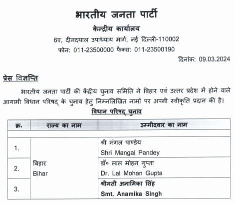 भाजपा ने बिहार में विधान परिषद चुनाव के लिए अपने उम्मीदवारों के नामों की घोषणा कर दी है. BJP ने मंगल पांडे, अनामिका सिंह और डॉ. लाल मोहन गुप्ता को MLC उम्मीदवार बनाया है.