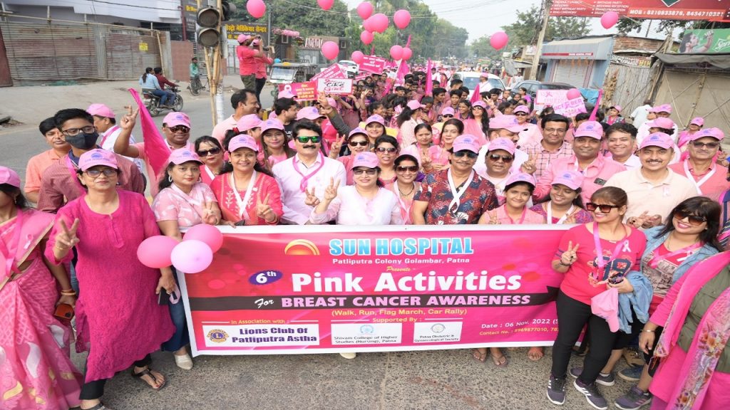 Breast Cancer Awareness को लेकर पटना में पाटलिपुत्र के सन हॉस्पिटल के तत्वाधान में रविवार को पाटलिपुत्र कॉलोनी से सुबह सात बजे ब्रेस्ट कैंसर जागरूकता के लिए पिंक एक्टिविटीज का आयोजन किया गया. अक्टूबर में ब्रेस्ट कैंसर अवेयरनेस मंथ के तहत सन हॉस्पिटल के द्वारा कई कार्यक्रम का आयोजन किया गया.