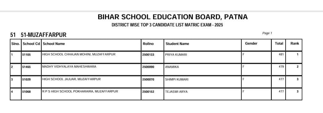 BSEB 10th Toppers List 2025: बिहार बोर्ड मैट्रिक का रिजल्ट जारी कर दिया गया है. टॉपर्स की लिस्ट भी सामने आ गई है. लड़कियों ने काफी अच्छा प्रदर्शन किया है. मुजफ्फरपुर में भी जिला स्तर पर टॉप 3 रैंक लड़कियों ने अपने हिस्से रखा है. पढे़ं पूरी खबर…