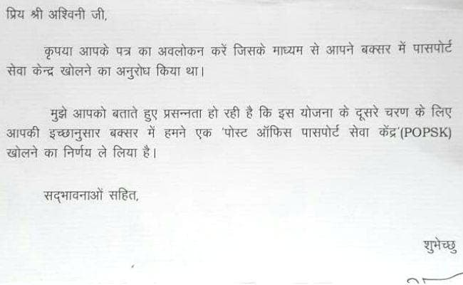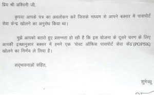 केन्द्र सरकार के विदेश मंत्रालय ने अनुज्ञप्ति जारी कर बक्सर में पोस्ट ऑफिस पासपोर्ट सेवा केंद्र खोले जाने की जानकारी दी. इससे अब बक्सर जिले के लोगों को पासपोर्ट बनवाने के लिए अब बाहर नहीं जाना होगा. विदेश मंत्री सुषमा स्वराज के दफ्तर से जारी पत्रांक 1166/ईएएम/2017 जारी कर स्थानीय सांसद अश्विनी चौबे को सूचित किया गया है कि जल्द ही बक्सर में पासपोर्ट सेवा केंद्र की स्थापना की जायेगी. बक्सर में पासपोर्ट सेवा केंद्र खुलनेसे समय और पैसे की भी बचत होगी. बक्सर में पासपोर्ट सेवा केंद्र खोले जाने की सूचना से स्थानीय लोगों में भी खुशी है.