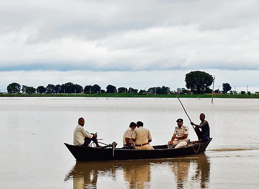 Photos: बिहार के बक्सर में गंगा का रौद्र रूप जारी है. बाढ़ का पानी कई इलाकों में घुस चुका है. हालात अब ऐसे हैं कि पुलिस थाना भी बाढ़ के पानी से घिर गया है. पुलिसकर्मी नाव से गश्ती करने को मजबूर हैं.