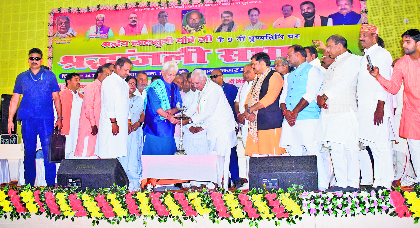 . भारतीय राजनीति का स्व. लालमुनी चौबे संत भी कहे जाते हैं. उनके नाम में मुनी लगा हुआ है. वहीं ढेर सारे लोग उन्हें बाबा कहा करते थे. वे राजनीति के योगिराज थे. योगीराज वही कहा जा सकता है जिसमें दूसरे को मुनी बनाने की क्षमता होती है. यही क्षमता लालमुनी चौबे में थी. उन्होंने कई संतों को स्थापित किया. जो देश में लोगों की सेवाओं में अपनी भूमिका निभाया. राजनीति में बाबा पहले ऐसा अध्यात्मिक राजनेता हैं. जिन्होंने जनता को सदैव ईश्वर माना और उनकी अराधना और सेवा की. ऐसा जगमगाता तारा किसी भी क्षेत्र, राज्य या प्रदेश को मुश्किल से मिलता है. हर एक राजनीतिज्ञ अपने दायित्व का निर्वहन करता है. उक्त बातें जम्मू एंड कश्मीर के उप राज्यपाल मनोज सिन्हा ने कहीं. उन्होंने कहा कि चौबे जी अपने दायित्व निर्वहन में बेजोड़ थे. उन्होंने राजनीति में बड़े सिद्धांत नहीं गढ़े. उनके विपक्षी भी उनके साथ थे. उनके विचारों व रिश्तों में मतभेद नहीं था. उनका पूरा जीवन सामाजिक सेवा के प्रति समर्पित था. वे काशी हिंदू विश्वविद्यालय के छात्र रहे है. जब विश्वविद्यालय के हिंदू शब्द को हटाने की बात आई तो स्व. चौबे ने आंदोलन की शुरूआत की. उनकी गिरफ्तारी हुई. लोगों के हित के लिए हमेशा खड़े रहे. उनमें जीवन भर बच्चों जैसी सरलता एवं सहजता बनी रही. वे 1972 में चैनपुर से जनसंघ से चुनाव जितना टेढ़ी खीर थी. इसके बावजूद उन्होंने जीता. युवाओं को स्व. लालमुनी चौबे के जीवन से प्रेरणा लेने की बात करते हुए कहा कि सार्वजनिक जीवन में जो लोग आते है उन्हें अपनी त्याग के लिए हमेशा तैयार रहना होगा. यही बाबा के लिए सच्ची श्रद्धांजलि होगी. स्व. लालमुनी चौबे के छात्र जीवन के काल के मित्रवत रहे मनोज सिंहा ने स्व. लालमुनी चौबे के 9वीं पुण्यतिथि के मौके पर आयोजित श्रद्धांजलि सभा को 1:23 से 1:43 तक कार्यक्रम को संबोधित किया. इसके साथ ही उन्होंने आगे संबोधित करते हुए कहा कि विधायक बनने के दो साल बाद ही उन्होंने जेपी आंदोलन में भागीदारी निभाई. आंदोलन में भागीदारी के लिए विधानसभा की सदस्यता से चार लोगों ने अपना इस्तीफा दिया था जिसमें पहला इस्तीफा स्व. चौबे ने दिया था. इसके पूर्व करीब नगर भवन में श्रद्धांजलि सभा में दोनों अतिथी करीब एक घंटे तक ठहरे. इस दौरान बिहार के राज्यपाल मो. आरिफ खान, जम्मू एंड कश्मीर के उपराज्यपाल मनोज सिंहा एवं बिहार प्रदेश भाजपा प्रदेश अध्यक्ष डॉ दिलीप जायसवाल ने दीप प्रज्ज्वलित कर एवं स्व. चौबे को पुष्पांजलि अर्पित कर श्रद्धांजलि दी. इसके पूर्व दोनों राज्यपाल कार्यक्रम में 12:58 में शामिल हुए एवं 12:54 में कार्यक्रम समापन के बाद रवाना हो गये. कार्यक्रम का संचालन रामकुमार सिंह एवं अध्यक्षता झूलन दूबे ने किया. वहीं श्रद्धांजलि सभा को संबोधित करते हुए बि