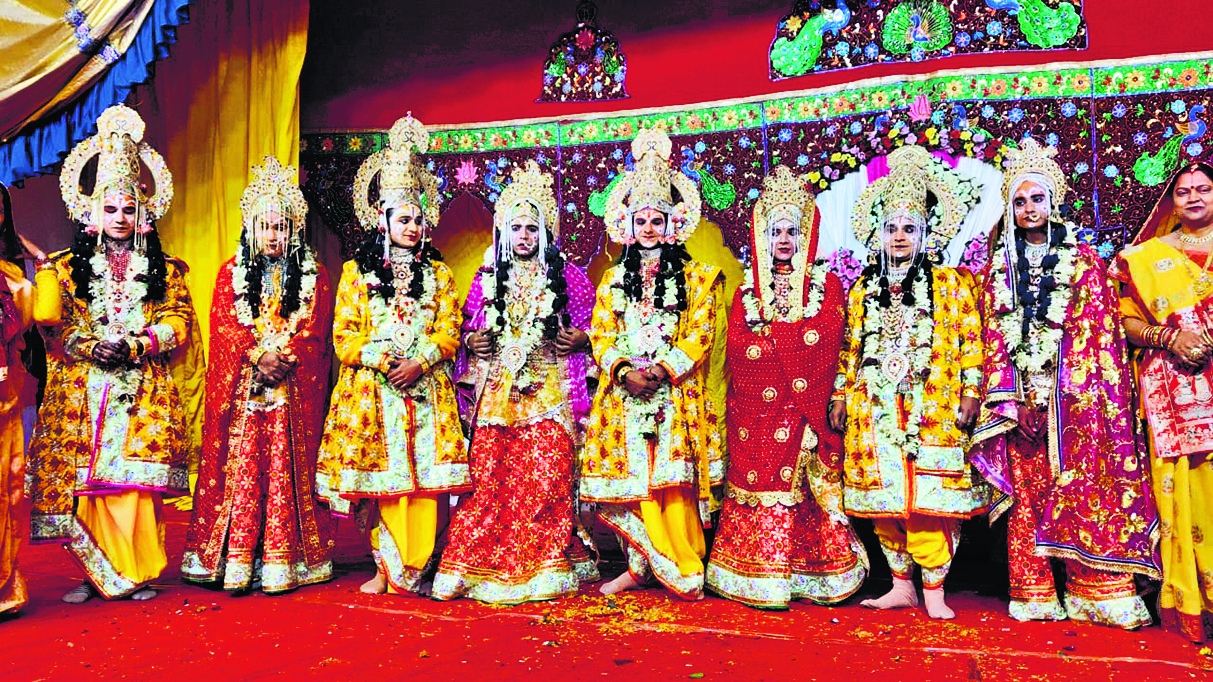 मंडप में गोत्राचार व गौरी-गणेश की पूजा की जाती है. उसी बीच देवता प्रकट होकर पूजा ग्रहण करते हैं. पूजा के बाद दुल्हा व दुल्हन को सुंदर आसन पर बिठाया जाता है. फिर शुभ मुहूर्त आते ही महाराज जनक व महारानी सुनैना आती है. विदेह राज जनक दामाद के रूप में वरण करते हुए श्रीराम के चरण पखारते हैं. इसके बाद दोनों पक्षों के पुरोहित वर व कन्या की हथेलियों को मिलाकर मंत्रोच्चार के बीच पाणिग्रहण कराते हैं. लोक व वेद की रीति के साथ महाराज जनक पुत्री सीता का कन्यादान करते हैं. वर व कन्या भांवरि के साथ फेरे लेते हैं और प्रभु श्रीराम जनक दुलारी सीता जी की मांग में सिंदूर दान करते हैं. यह देख देव गाण आसमान से पुष्प की बारिश करते हैं. जबकि तालियों की गड़गड़ाहट के बीच दर्शक जय सियाराम का उदघोष करते हैं.परिणय सूत्र में बंधे भरत, लक्ष्मण व शत्रुघ्न