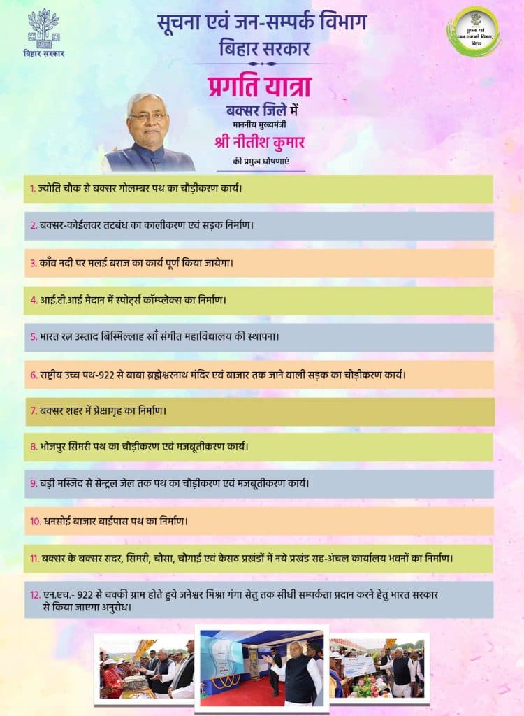 सीएम नीतीश ने आज बक्सर में ज्योति चौक से बक्सर गोलम्बर पथ का चौड़ीकरण, बक्सर-कोईलवर तटबंध का कालीकरण एवं सड़क निर्माण कराने की घोषणा की. इसके अलावा उन्होंने काँव नदी पर मलई बराज का काम, आई.टी.आई मैदान में स्पोर्ट्स कॉम्प्लेक्स का निर्माण, भारत रत्न उस्ताद बिस्मिल्लाह खाँ संगीत महाविद्यालय की स्थापना कराने की भी घोषणा की. सीएम ने यहां राष्ट्रीय उच्च पथ-922 से बाबा ब्रह्मेश्वरनाथ मंदिर एवं बाजार तक जाने वाली सड़क का चौड़ीकरण का काम, बक्सर शहर में प्रेक्षागृह का निर्माण, भोजपुर सिमरी पथ का चौड़ीकरण एवं मजबूतीकरण काम, बड़ी मस्जिद से सेन्ट्रल जेल तक पथ का चौड़ीकरण एवं मजबूतीकरण का काम, धनसोई बाजार बाईपास पथ का काम, बक्सर के बक्सर सदर, सिमरी, चौसा, चौगाई एवं केसठ प्रखंडों में नये प्रखंड सह-अंचल कार्यालय भवनों के निर्माण कराया जाएगा.