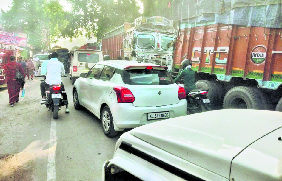 नगर के सिंडिकेट पर ओवरलोड ट्रक बीचों-बीच फंस जाने से सुबह 5 बजे ही से ही लग गयी जाम