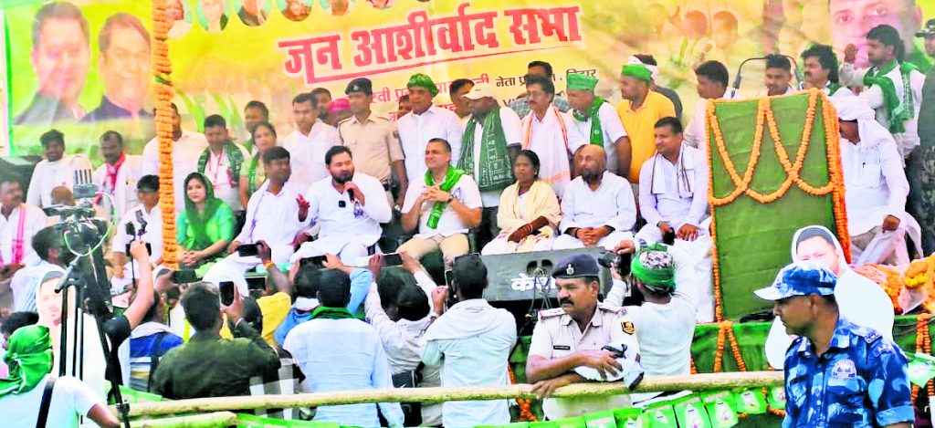 फाइल-8- 26 मई- फोटो- 7-सभा में मंचासीन पूर्व उपमुख्यमंत्री तेजस्वी यादव, मुकेश साहनी व अन्य 26 मई- फोटो- 8- सभा में उपस्थित भीड़ ब्रह्मपुर. महागठबंधन प्रत्याशी सुधाकर सिंह के पक्ष में रविवार को चुनावी जनसभा करने नेता प्रतिपक्ष के नेता तेजस्वी यादव, वीआइपी सुप्रीमो मुकेश सहनी, ब्रह्मपुर के हाईस्कूल के मैदान में पहुंचे. तपती धूप में जनसभा को संबोधित करते हुए उन्होंने कहा कि तुम मुझे वोट दो, मैं तुझे नौकरी दूंगा. यदि हमारी सरकार बनती है तो एक करोड़ लोगों को नौकरी देने का काम किया जायेगा. नेता प्रतिपक्ष तेजस्वी यादव ने जनसभा को संबोधित करते हुए कहा कि गर्मी में आप सभी लोग यहां सुनने आए हैं, आप सभी का हम हाथ जोड़कर धन्यवाद देते हैं, अभिनदंन करते हैं. आप सभी लोग जानते हैं कि यहां एक जून को मतदान और यहां से हमारे प्रत्याशी सुधाकर सिंह उम्मीदवार हैं. जो पढ़े लिखे हैं, और मुझे पूरा भरोसा है कि इन्हें भारी मतों से आप सभी विजयी बनाने का काम करेंगे.उन्होंने कहा कि प्रधानमंत्री नरेंद्र मोदी से हिसाब मांगने पर जेल भेजवाने का धमकी दे रहे हैं. बिहारी गुजराती से डरता नहीं है. बिहारी किसी से डरता नहीं है. धमकी दे रहे हैं कि हमें चुनाव हराओगे तो हम तुम्हें जेल भेज देंगे तो अब जनता फैसला करेगी. उन्होंने कहा कि यदि हमारी सरकार बनी तो गैस का दाम 500 रुपये सिलेंडर किया जाएगा, 200 यूनिट बिजली फ्री दी जाएगी. जो गरीब परिवार की बहने हैं, हर साल उनके खाते में एक लाख रुपये उनके सहयोग के लिए जाएगा. यानी हर महीने आठ हजार 333 रुपये सीधे उनके खाते में जाएगा. यह सारा काम हम लोग करने जा रहे हैं. हम आप लोगों से यही कहना चाह रहे हैं कि आप लोग एकदम अपना मिजाज टनाटन-टनाटन-टनाटन रखिए. नौकरी मिलेगा फटाफट-फटाफट-फटाफट. गरीब बहनों के खाता में लाख रुपये जाएगा खटाखट- खटाखट-खटाखट और भाजपा का हो जाएगा सफाचट-सफाचट-सफाचट.और सुधाकर सिंह को वोट मिलेंगे खटाखट-खटाखट-खटाखट. खत्म करना चाहते हैं देश का संविधान: मुकेश सहनी वीआईपी के अध्यक्ष मुकेश सहनी ने कहा कि संविधान खतरे में है. बाबा साहेब का बनाया हुआ संविधान हैं. भाजपा वाले देश का संविधान खत्म करना चाहते हैं. हम लोगों को वोट दीजिए, हम लोग आपको नौकरी देंगे. संविधान बचाने व गरीबों की हक दिलाने के लिए इस बार वोट करने का उन्होंने जनता से आह्वान की. इस अवसर पर विधायक शंभू सिंह यादव, पूर्व सांसद तेज नारायण सिंह, जिलाध्यक्ष शेषनाथ सिंह कांग्रेस जिलाध्यक्ष मनोज पाण्डेय आदि उपस्थित थे.