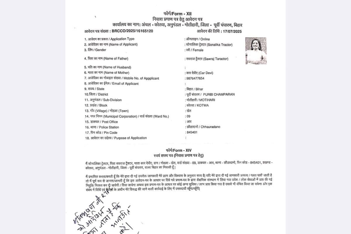Bihar News: बिहार में सरकारी कागजातों की सुरक्षा और सत्यापन प्रणाली की पोल एक बार फिर खुल गई है. इस बार पूर्वी चंपारण के कोटवा अंचल कार्यालय में ‘सोनालिका ट्रैक्टर’ नाम से फर्जी निवास प्रमाण पत्र का आवेदन सामने आया है, जिसमें भोजपुरी अभिनेत्री मोनालिसा की तस्वीर का दुरुपयोग किया गया.