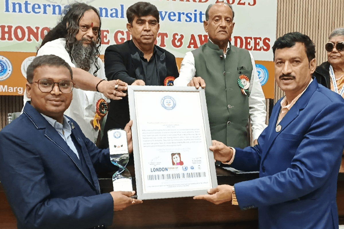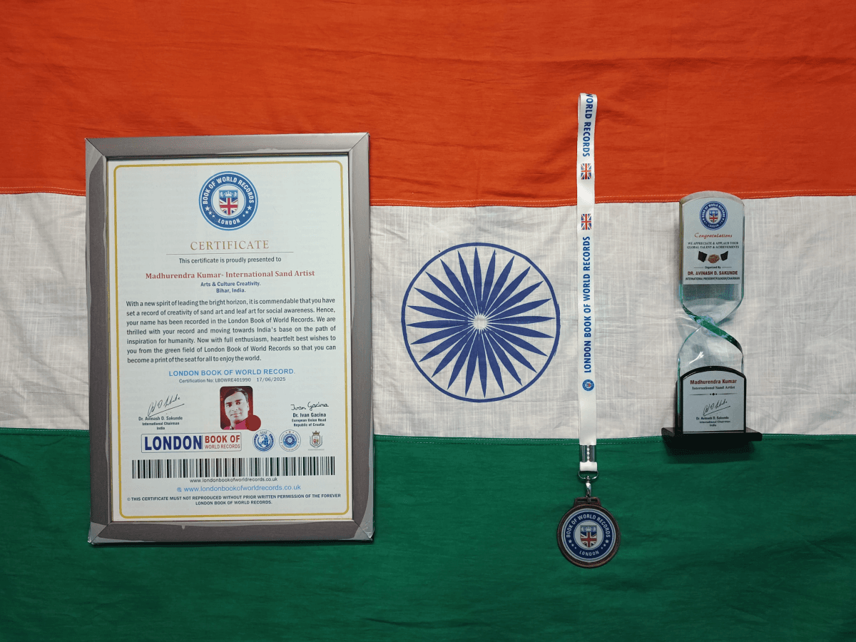 भारतीय कला इतिहास में पहली बार युवा रेत कलाकर मधुरेंद्र कुमार ने सात समुंदर पार लंदन बुक ऑफ वर्ल्ड रिकॉर्ड्स का सम्मान पाकर पूरे भारत और बिहार को गौरवान्वित किया है. उन्हें यह सम्मान ब्रिटिश पार्लियामेंट लंदन में आयोजित समारोह के दौरान दिया गया. समारोह में लंदन बुक ऑफ वर्ल्ड रिकॉर्ड के अंतर्राष्ट्रीय अध्यक्ष डॉ. अविनाश डी. सकुंडे और यूरोपीय संघ के प्रमुख डॉ. इवान गैसीना ने उन्हें सम्मानित किया.