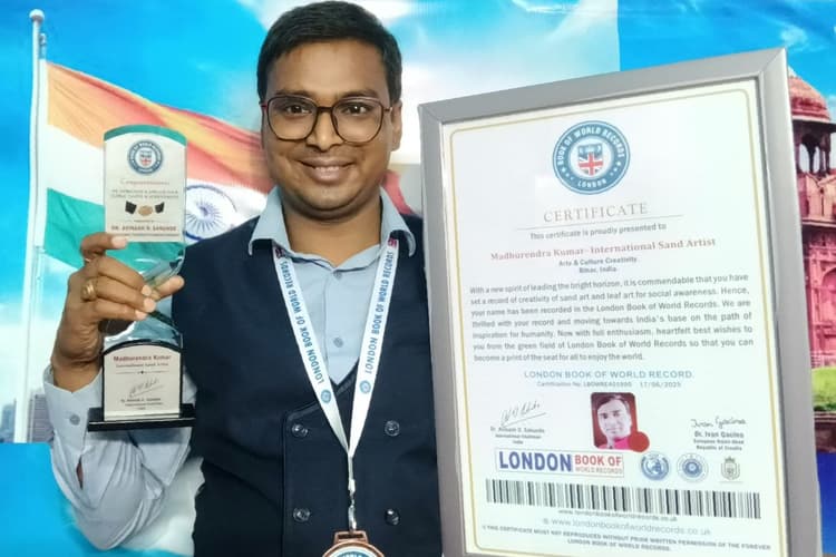 भारतीय कला इतिहास में पहली बार युवा रेत कलाकर मधुरेंद्र कुमार ने सात समुंदर पार लंदन बुक ऑफ वर्ल्ड रिकॉर्ड्स का सम्मान पाकर पूरे भारत और बिहार को गौरवान्वित किया है. उन्हें यह सम्मान ब्रिटिश पार्लियामेंट लंदन में आयोजित समारोह के दौरान दिया गया. समारोह में लंदन बुक ऑफ वर्ल्ड रिकॉर्ड के अंतर्राष्ट्रीय अध्यक्ष डॉ. अविनाश डी. सकुंडे और यूरोपीय संघ के प्रमुख डॉ. इवान गैसीना ने उन्हें सम्मानित किया.