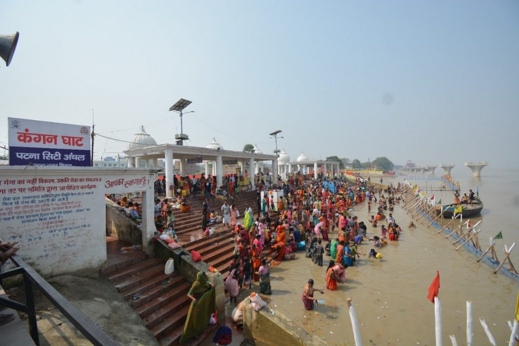 प्रत्यक्ष देवता भगवान सूर्य और छठी मैया की विशेष पूजा से जुड़ा यह पावन पर्व बिहार, उत्तर प्रदेश, झारखंड समेत देश के अन्य हिस्से में बड़ी धूम-धाम से मनाया जाता है. यह तस्वीर पटना के गंगा नदी की है. अस्ताचलगामी सूर्य को अर्घ्य देने से पहले महिलाओं ने आज गंगा स्नान किया.