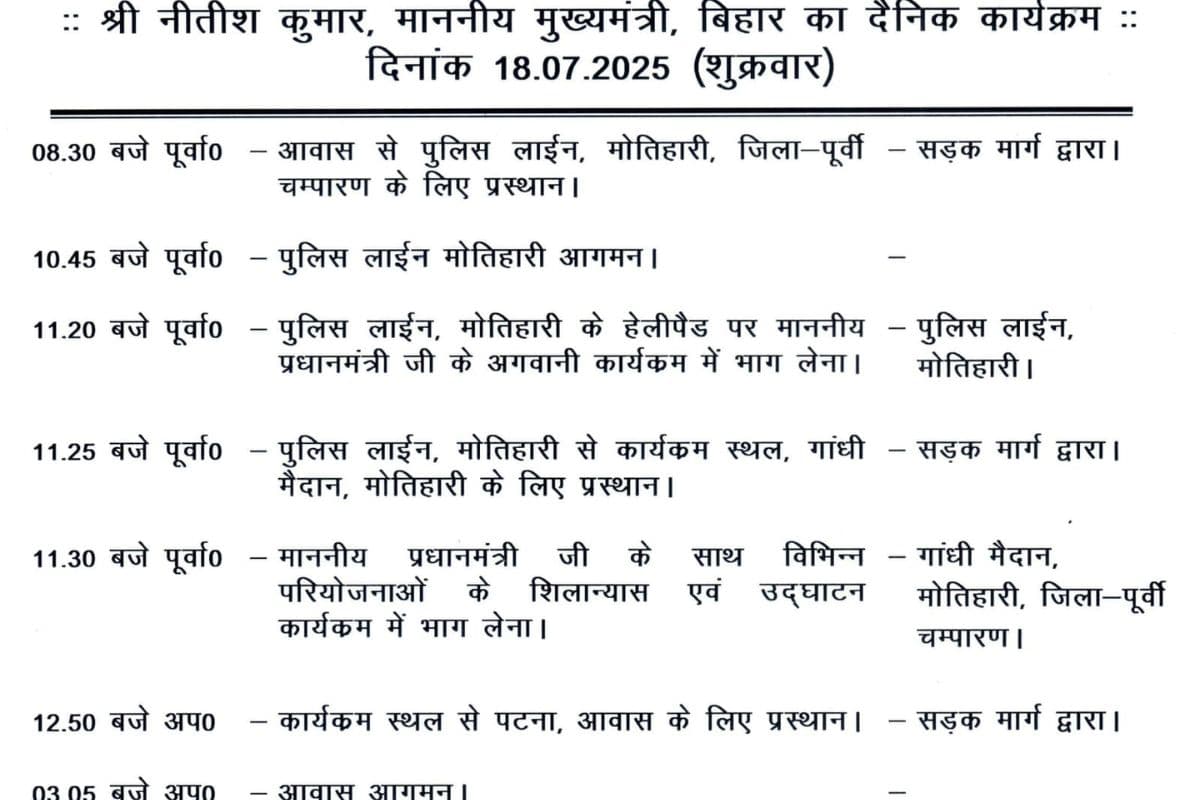 मुख्यमंत्री ऑफिस की तरफ से जारी किए गए नोटिफिकेशन के मुताबिक मुख्यमंत्री 08.30 बजे सीएम आवास से पुलिस लाईन, मोतिहारी के लिए सड़क के रास्ते रवाना होंगे. इसके बाद वह सुबह 10.45 बजे पुलिस लाईन मोतिहारी पहुंचेंगे. यहां वह सुबह 11.20 बजे पुलिस लाईन, मोतिहारी के हेलीपैड पर प्रधानमंत्री की अगवानी करेंगे. इसके बाद दोनों नेता 11.25 बजे पुलिस लाईन, मोतिहारी से कार्यकम स्थल, गांधी मैदान, मोतिहारी के लिए रवाना होंगे. 11.30 बजे दोनों नेता विभिन्न परियोजनाओं का शिलान्यास एवं उद्घाटन कार्यकम में भाग लेंगे. कार्यक्रम खत्म होने के बाद मुख्यमंत्री 12.50 बजे पटना, आवास के लिए रवाना होंगे और 3.05 बजे अपने आवास पर पहुंचेंगे. इसके बाद वह शाम 5.00 बजे मंत्रिपरिषद् की बैठक में शामिल होंगे.