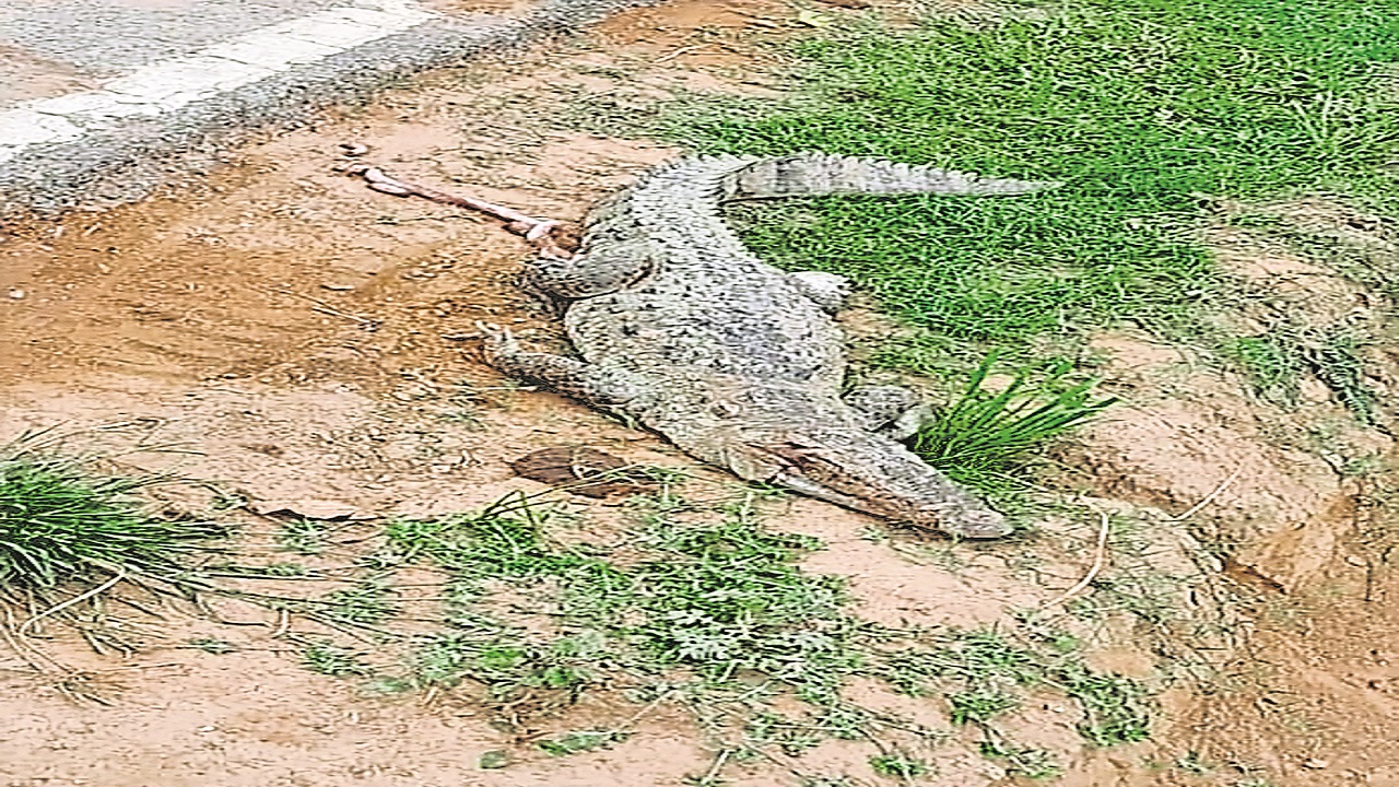 बगहा-सेमरा मुख्य सड़क मार्ग में महिला थाना के पास शनिवार की सुबह लोगों ने एक मगरमच्छ को देखा. मगरमच्छ के थाने के पास होने की सूचना पूरे गांव में फैल गयी. पुलिस वालों ने वन विभाग की टीम को बुलाया. जब टीम वहां पहुंची तो पता चला की उसकी मौत किसी अज्ञात वाहन के धक्के से हो गयी है. बताया जा रहा है कि वाल्मीकि टाइगर रिजर्व के वन क्षेत्रों से आये दिन जंगली जानवरों समेत सरीसृप प्रजाति के जीवों का भटकना थम नहीं रहा है. जिससे वनवर्ती क्षेत्र के लोगों में दहशत का माहौल कायम है.