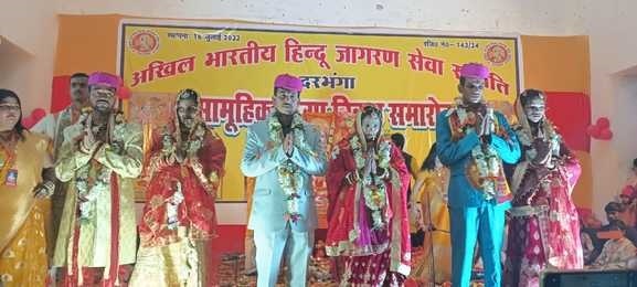 अखिल भारतीय हिंदू जागरण सेवा समिति की ओर से पहली बार जिले में सामूहिक विवाह का आयोजन किया गया. बुधवार को नगर भवन में आयोजित सामूहिक विवाह कार्यक्रम को लेकर लोगों में उत्साह देखते बन रहा था. वर -वधू पक्ष एवं समाज के प्रबुद्ध लोगों ने आयोजन की जमकर प्रशंसा की. तय समय के अनुसार शुरू आयोजन में समिति के सदस्यों ने बारातियों की खूब खातिरदारी की. कुल चार जोड़ी विवाह संपन्न हुआ. डीहलाही की चांदी कुमारी व डघरौल के सुनील कुमार विवाह बंधन बंधे. इसी तरह फुनौरा के दिव्या राज की शादी नाका पांच के रौशन बाड़ी से, बेंता की चंदा कुमारी का विवाह मधुबनी के कृष्ण मोहन पंजियार से एवं सिंघिया की किरण कुमारी का विवाह पैगंबरपुर केवटी के सोनू कुमार के साथ हुआ.पुष्प वर्षा कर बरातियों का हुआ स्वागत