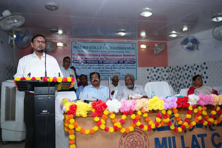 Darbhanga News: दरभंगा. मिल्लत कॉलेज में “भारत के विकास में महिलाओं की भूमिका ” विषय पर संगोष्ठी प्रधानाचार्य डॉ सिद्धार्थ शंकर सिंह की अध्यक्षता में हुई. उद्घाटन करते हुए कुलपति प्रो. संजय कुमार चौधरी ने कहा कि आज महिलाएं जीवन के हर क्षेत्र में तेजी के साथ आगे बढ़ रही है. पिछले दिनों भारत और पाकिस्तान के बीच तनावपूर्ण संघर्ष की स्थिति में भारतीय महिला सैन्य पदाधिकारियों ने अपनी महत्वपूर्ण भूमिका निभायी. कहा कि राज्य सरकार ने लड़कियों को 35 प्रतिशत आरक्षण, विभिन्न प्रकार का स्कॉलरशिप सहित विभिन्न योजनाओं से राशि प्रदान कर उन्हें सशक्त बनाने का कार्य की है. इस दौरान कुलपति सहित मंचासीन अतिथियों ने सेमिनार की स्मारिका का विमोचन किया.