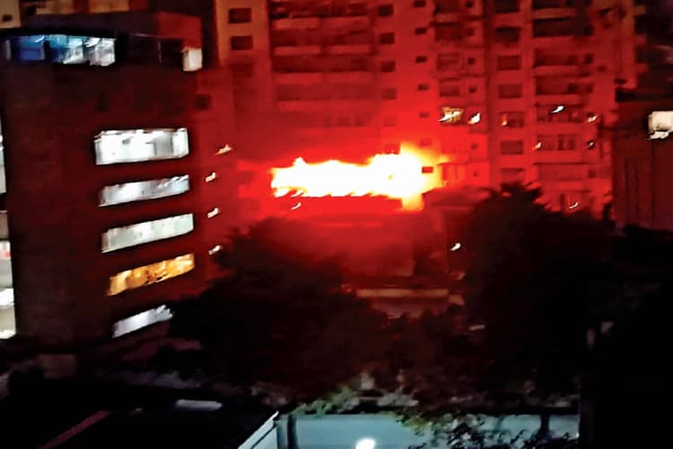शाम 6:30 बजे दूसरे तल पर एक फ्लैट में दीये से लगी आग, सिलिंडर फटने से फैल गयी आग, धुआं फैलने से बिल्डिंग में मची अफरातफरी