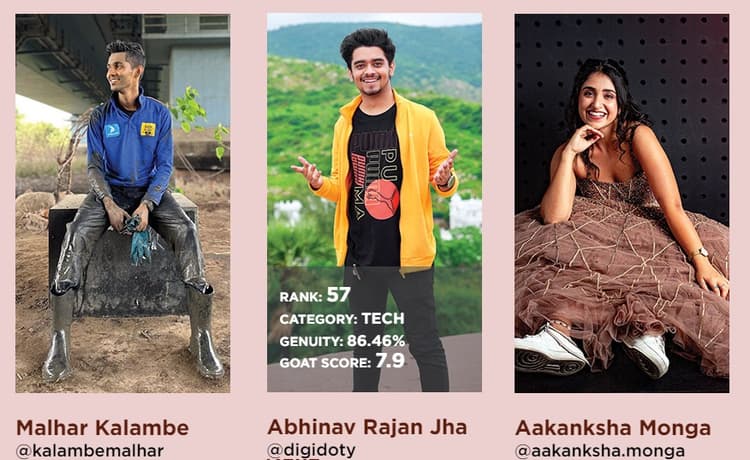 ‘भारत के शीर्ष 100 डिजिटल सितारों’ की सूची के साथ, फोर्ब्स इंडिया गोट-ग्रुपएम के ब्रांड-सुरक्षित प्रभावशाली और सामग्री विपणन समाधान के साथ-साथ मात्रात्मक और गुणात्मक उपायों को ध्यान में रखते हुए 100 रचनाकारों के काम को इस सूची में जगह दी है. दूसरा संस्करण नौ श्रेणियों में फैला है, जिनमें कॉमेडी, सौंदर्य, फैशन और जीवनशैली, व्यवसाय और वित्त, स्वास्थ्य और फिटनेस, भोजन, तकनीक, यात्रा और फोटोग्राफी, और सामाजिक कार्य शामिल है.