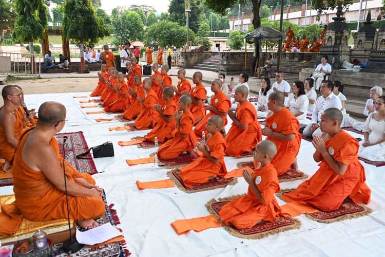 फोटो- गया बोधगया 207- महाबोधि मंदिर में बोधिवृक्ष की छांव तले दीक्षा ग्रहण करते थाइलैंड के किशोर वरीय संवाददाता, बोधगया. बौद्ध परंपरा के मुताबिक सोमवार को महाबोधि मंदिर में बोधिवृक्ष की छांव तले थाईलैंड के 20 किशोर धम्म की दीक्षा ली. बोधगया स्थित रॉयल वट़् थाई मंदिर के मुख्य पुजारी ने थाइलैंड से आये बच्चों को दीक्षा दी व अब वे सभी बौद्ध मठों में प्रवास करते हएु बौद्ध भिक्षुओं की तरह जीवन यापन करेंगे. हालांकि, वे कितने दिनों तक बौद्ध भिक्षु की तरह जीवन व्यतीत करेंगे, यह उनकी मर्जी पर निर्भर करता है. इसके लिए समयावधि को लेकर कोई प्रतिबंध नहीं होता है. ऐसी मान्यता है कि बौद्ध धर्म मानने वाले को जीवन में एक मर्तबा बौद्ध धम्म की दीक्षा लेकर बौद्ध भिक्षुओं की तरह जीवन यापन करना धार्मिक अनिवार्यता है. इसी का अनुपालन करते हुए ज्यादातर थाइलैंड के श्रद्धालु अल्प काल के लिए ही सही दीक्षा ग्रहण कर भिक्षुओं की तरह बौद्ध मठों में प्रवास करते हैं व आचरण और अनुशासन प्रस्तुत करते हैं.