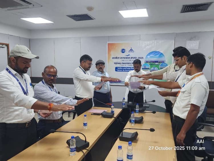 वरीय संवाददाता, बोधगया. केंद्रीय सतर्कता आयोग के निर्देशानुसार भारतीय विमानपत्तन प्राधिकरण 27 अक्तूबर से दो नवंबर तक देश के सभी हवाई अड्डों व अन्य कार्यालयों में सतर्कता जागरूकता सप्ताह का आयोजन कर रहा है. इस क्रम में भारतीय विमानपत्तन प्राधिकरण के गया हवाई अड्डे पर कार्मिकों, हितधारकों व बच्चों के लिए विभिन्न कार्यक्रमों का आयोजन किया जा रहा है. सतर्कता जागरूकता सप्ताह के शुभारंभ में 27 अक्तूबर को गया हवाई अड्डे पर भी कार्मिकों को सत्यनिष्ठा की प्रतिज्ञा दिलायी गयी. उक्त कार्यक्रम में एयरपोर्ट डायरेक्टर बगंजीत साहा, संयुक्त महाप्रबंधक अवधेश कुमार, सतर्कता जागरूकता सप्ताह के नोडल अधिकारी अमित पांडेय समेत अन्य अधिकारी व कर्मचारी उपस्थित रहे.