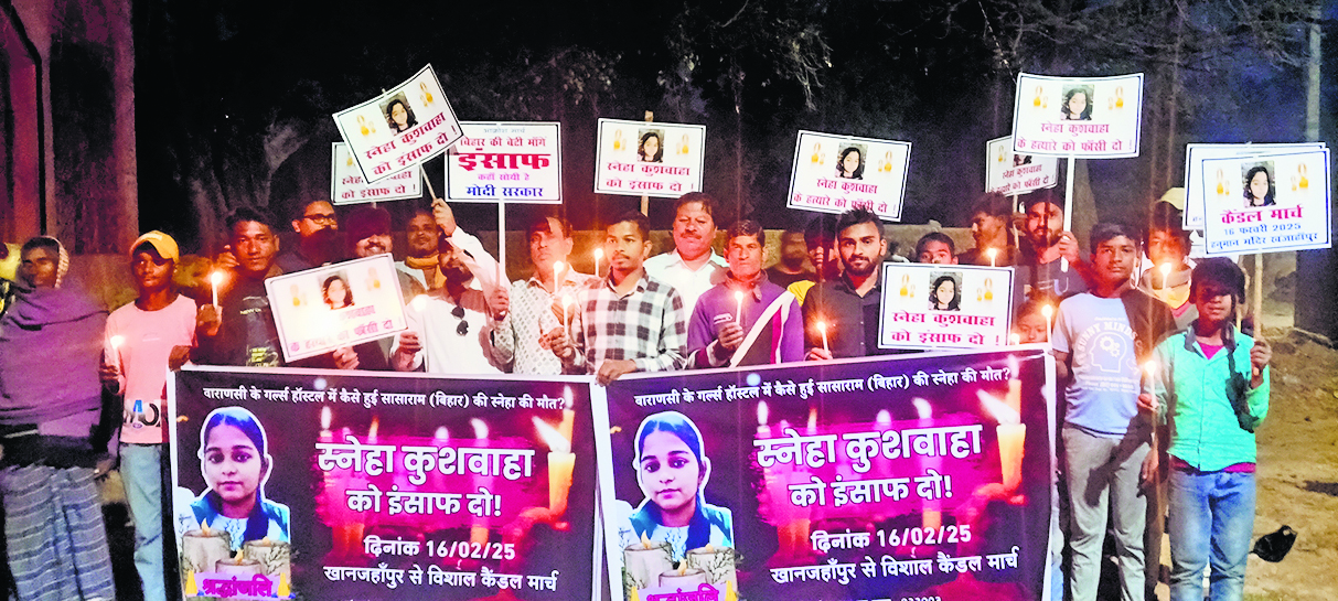 मानपुर. रोहतास जिले की रहनेवाली 18 वर्षीय स्नेहा कुशवाहा की वाराणसी हॉस्टल में हत्या के विरोध में रविवार को नगर निगम वार्ड 47 के खंजाहपुर मुहल्ले से सैकड़ों की संख्या में छात्र-छात्राएं सामाजिक कार्यकर्ता ने कैंडल मार्च प्रदर्शन किया और न्याय की गुहार लगायी. मौन जुलूस सह कैंडल मार्च प्रदर्शन का नेतृत्व कर रहे किसान नेता सह नगर निगम वाटर वार्ड के पूर्व चेयरमैन इंद्रदेव विद्रोही ने बताया कि यूपी सरकार स्नेहा कुशवाहा हत्या मामले को दबाने में जुटी हुई है. उनके परिवारवालों को न्याय मिलना चाहिए. वहीं, सामाजिक कार्यकर्ता सह बुनकर नेता गोपाल पटवा ने कैंडल जुलूस में कहा कि केंद्र सरकार इस मामले को रिटायर्ड जज की टीम बनाकर जांच कराये, ताकि किसी भी गरीब के बेटी को न्याय मिल सके. इस मौके पर वार्ड 48 के पार्षद प्रतिनिधि विजय पटवा, जिला परिषद सदस्य कुंदन कुमार उर्फ भोला चौधरी, विजय कुमार पान, पूर्व पार्षद उषा वर्मा, अक्षय कुमार, चिंटू कुमार, चंदन कुमार वर्मा समेत अन्य छात्र छात्राएं व सामाजिक कार्यकर्ता शामिल थे.