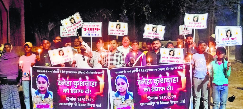 Gaya News : रोहतास जिले की रहनेवाली 18 वर्षीय स्नेहा कुशवाहा की वाराणसी हॉस्टल में हत्या के विरोध में रविवार को नगर निगम वार्ड 47 के खंजाहपुर मुहल्ले से सैकड़ों की संख्या में छात्र-छात्राएं सामाजिक कार्यकर्ता ने कैंडल मार्च प्रदर्शन किया.
