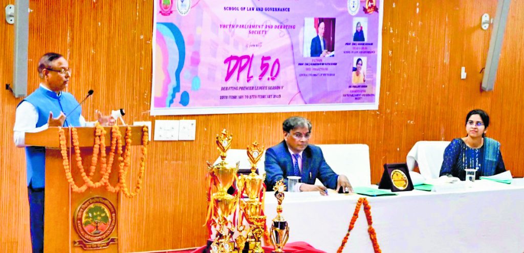 गया. एक साथ आना शुरुआत है, एक साथ बैठना प्रगति है और एक साथ काम करना सफलता है. उक्त वक्तव्य सीयूएसबी के कुलपति प्रो कामेश्वर नाथ सिंह ने डिबेटिंग प्रीमियर लीग (डीपीएल) 5.0 के उद्घाटन समारोह में दिया. सीयूएसबी के स्कूल ऑफ लॉ एंड गवर्नेंस (एसएलजी) द्वारा आयोजित डीपीएल 5.0 के उद्घाटन समारोह के अपने अध्यक्षीय संबोधन में कुलपति ने सहयोग और समग्र विकास विषय पर अपने विचार रखे. उन्होंने समग्र विकास के चार स्तंभों पर प्रकाश डालते हुए कहा कि सर्वांगीण व्यक्तित्व के निर्माण में औपचारिक और अनौपचारिक शिक्षा दोनों की महत्वपूर्ण भूमिका है. कुलपति प्रो के एन सिंह ने प्रभावी संचार, समन्वय और भारत की अंतर्निहित शक्तियों, उसकी विविधता, लोकतंत्र और जनसांख्यिकी के महत्व को रेखांकित किया. अंत में उन्होंने आयोजकों को बधाई देते हुए नेतृत्व और बौद्धिक विकास को पोषित करने के लिए डीपीएल जैसे प्लेटफार्मों को जारी रखने के लिए प्रोत्साहित किया. पीआरओ मोहम्मद मुदस्सीर आलम ने बताया कि उपस्थित लोगों का स्वागत करते हुए प्रो अशोक कुमार ने आलोचनात्मक सोच और भागीदारी पूर्ण लोकतंत्र को बढ़ावा देने में वाद-विवाद के महत्व को रेखांकित किया.