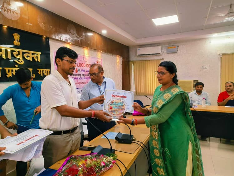 गया. वित्तीय वर्ष 2023- 24 में जिले में तीन व चार बार रक्तदान करनेवाले रक्तदाताओं को डीएम डॉ त्यागराजन एसएम ने शुक्रवार को कार्यक्रम आयोजित कर समाहरणालय सभागार में सम्मानित किया. सम्मान समारोह में डीएम ने कहा कि ये पूरे मगध क्षेत्र के लिए गौरव का विषय है कि लोग इंसानियत के लिए किसी असहाय को रक्तदान कर रहे हैं और ये सबसे बड़ा धर्म है. सभी लोगों को इसके लिए आगे आना चाहिए, ताकि, जरूरतमंदों को आसानी से ब्लड उपलब्ध हो सके. समाजसेवा का यह सबसे बड़ा रूप है. इसकी जितनी प्रशंसा किया जाये बहुत ही कम होगा. एएनएमएमसीएच स्थित ब्लड बैंक के प्रभारी डॉ दिलीप कुमार पांडेय ने कहा कि जिला में शहीद भगत सिंह यूथ ब्रिगेड, शहीद भगत सिंह यूथ परिवार, संत निरंकारी संस्था, ह्यूमन हुड फाउंडेशन, दक्षिण बिहार केंद्रीय विश्वविद्यालय के रिसर्च स्कॉलर वअखिल विश्व गायत्री परिवार एक ऐसी संस्था हैं, जो जिला में रक्त की कमी को कभी महसूस नहीं होने दी है. युवाओं को नियमित रक्तदान को लेकर प्रेरित करते आयी है. सम्मान समारोह में अमरनाथ, पूनम कुमारी, अभिषेक कुमार, सुदीप कुमारी, सुधीर कुमार, आयुष कुमार वर्मा, अरविंद कुमार, राजेश कुमार, मनीष शुक्ला, अमित कुमार आदि को सम्मानित किया गया. कार्यक्रम को सफल बनाने में एएनएमएमसीएच के डॉ लालदेव, डॉ अनिमेष, लैब टेक्नीशियन, शिव कुमार, विशाल कुमार, परामर्शी रवि प्रकाश, जय किशोर कुमार आदि मौजूद थे.