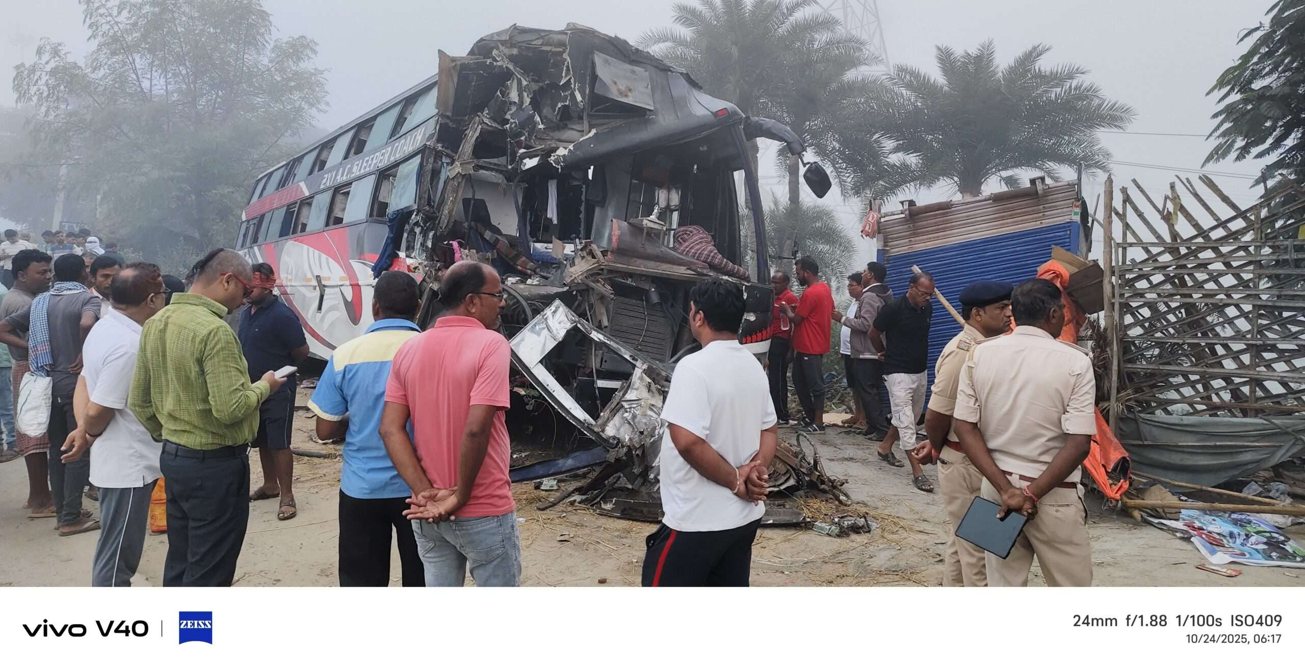 जीटी रोड पर शेरघाटी के नयी बाजार के पास हुई घटना सारनाथ से दर्शन कर बोधगया लौट रहा था डेढ़ सौ श्रद्धालुओं का एक दल फोटो – गया शेरघाटी- 1000- क्षतिग्रस्त बस. फोटो – गया शेरघाटी- 1001- बस में फंसे चालक के शव को बाहर निकालते लोग. प्रतिनिधि, शेरघाटी शेरघाटी के नयी बाजार स्थित जीटी रोड पर शुक्रवार की अहले सुबह एक यात्री बस हादसे का शिकार हो गयी. कुहासे की वजह से बस अनियंत्रित होकर अज्ञात वाहन से टकरा गयी, जिसमें बस चालक अक्षय उजावने की मौके पर ही मौत हो गयी. इस घटना में लगभग 15 यात्री घायल हो गये. इनमें से तीन की हालत काफी गंभीर बतायी जा रही है. हादसे के तुरंत बाद स्थानीय पुलिस मौके पर पहुंची और राहत बचाव कार्य शुरू किया. बस में फंसे यात्रियों को काफी मशक्कत के बाद सुरक्षित बाहर निकाला गया. बस में सवार सभी यात्री महाराष्ट्र के विभिन्न क्षेत्रों माहुरगढ़, नांदेड़ गायकवाड़ और डोरीबली के रहने वाले हैं. श्रद्धालुओं ने बताया कि तीन बसों में लगभग डेढ़ सौ की संख्या में उनका एक दल सारनाथ से दर्शन कर बोधगया लौट रहा था. इसी दौरान शेरघाटी के पास घना कोहरा होने के कारण बस चालक वाहन पर नियंत्रण नहीं रख पाया और आगे के वाहन से टकरा गया. यात्रियों ने बताया कि गनीमत रही कि बस सड़क किनारे गहरे खाई में गिरने से बच गयी अन्यथा बड़ा हादसा हो सकता था. घायलों में अरुण उजावने, असित यादव, गणेश नारायण पवार, सरस्वती, सुरेखा कुमारी, आदित्य, सरिता डोगरे, अशोक गैदाजी वनसोड़े, प्रेम गायकवाड, संजीवनी प्रेम, मेघानी सुखे सहित अन्य शामिल हैं. इनमें से चार लोगों को बेहतर इलाज के लिए मगध मेडिकल कॉलेज अस्पताल, गया जी रेफर किया गया है. हादसे के बाद घायल यात्रियों ने शेरघाटी पुलिस और स्थानीय लोगों की सराहना की. यात्रियों ने कहा कि समय पर पुलिस नहीं पहुंचती तो स्थिति और भी गंभीर हो सकती थी, क्योंकि कई लोग बेहोशी की हालत में थे और बस के अंदर फंसे हुए थे और बच्चे चिल्ला रहे थे. घटनास्थल पर प्रशिक्षु डीएसपी सह थानाध्यक्ष अभिषेक कुमार सिंह, एडिशनल थानेदार मोहन कुमार सहित पुलिस बल मौजूद रहा और पूरे घटनाक्रम पर निगरानी रखते हुए घायलों की सहायता में सक्रिय रहे. पुलिस ने क्षतिग्रस्त बस को सड़क किनारे हटाकर यातायात को सामान्य कराया और आगे की कार्रवाई में जुट गयी.