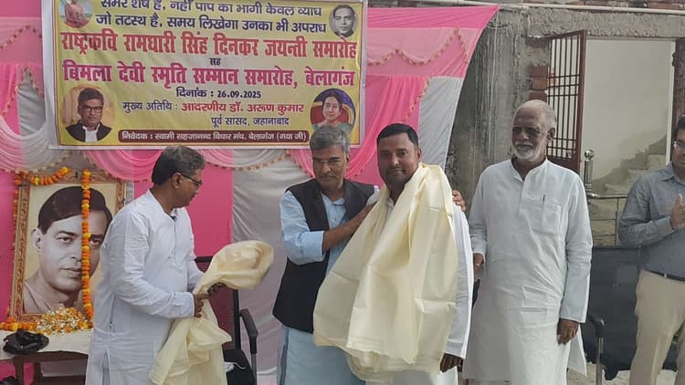बेलागंज. बेलागंज स्थित सभागार में राष्ट्रकवि रामधारी सिंह दिनकर जयंती और विमला देवी स्मृति सम्मान समारोह का आयोजन हुआ. इसकी अध्यक्षता समाजसेवी जितेंद्र कुमार और संचालन पूर्व शिक्षक शशि भूषण चौरसिया ने किया. पूर्व सांसद अरुण कुमार ने कहा कि साहित्य संस्कृति को जन्म देती है और जब राजनीति भटकती है तो उसे साहित्य ही संभालता है. उन्होंने आर्थिक शक्ति के बावजूद भारत की सांस्कृतिक श्रेष्ठता पर जोर देते हुए कहा कि आज भारत के प्रधानमंत्री अमेरिका से आंख में आंख मिलाकर बात करते हैं. उन्होंने दिनकर को जनकवि बताते हुए समाज में जातीय कटुता फैलाने वालों के प्रति चेतावनी दी. विमला देवी स्मृति सम्मान के तहत विभिन्न शैक्षणिक संस्थानों के नामांकित बच्चों को सम्मानित किया गया. समारोह में पूर्व मुखिया रामविनय सिंह, अनिल कुमार, सिद्धू शर्मा, पंकज कुमार, ओम प्रकाश शर्मा सहित बड़ी संख्या में बुद्धिजीवी उपस्थित थे.