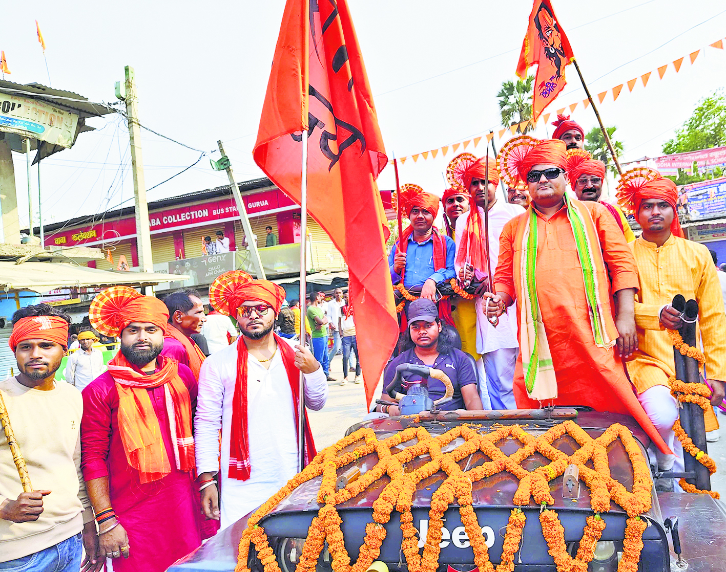 गुरुआ. गुरुआ प्रखंड क्षेत्र में रामनवमी पर्व को लेकर सोमवार को बजरंग दल के द्वारा घोड़े एवं रथ के साथ भव्य तरीके से शोभायात्रा निकाली गयी. इसका शुभारंभ भाजपा के प्रदेश मंत्री अमित कुमार दांगी, सतीश कुमार, दीपक, आकाश आर्यन, ऋषि भारद्वाज, बाॅबी कुमार, अनिल कुमार यादव व अन्य ने संयुक्त रूप से किया. शोभा यात्रा सोमवार को गुरुआ बाजार के बस स्टैंड से लेकर बड़ही बिगहा मोड होते हुए पासीटोला तक गयी. फिर पासी टोला से गुरुआ बाजार होते हुए हाइ स्कूल के मैदान में पहुंचकर संपन्न हुई. इस बीच रामनवमी पर बाजार में झांकी भी निकाली गयी. शोभायात्रा में शामिल भाजपा के वरिष्ठ नेता विनय कुमार, मंडल अध्यक्ष मंटू सिंह, महामंत्री आनंद कुमार, वरीय नेता नंदकिशोर प्रसाद, भाजपा महामंत्री अनिल कुमार यादव, अखिलेश सिंह, बजरंग दल के अध्यक्ष विक्की आलोक कुमार अग्रवाल, अखिलेश सिंह, मोनू कुमार, सतीश पांडेय, रंजन कुमार, विशाल कुमार, भोला यादव, मिथिलेश पांडेय, सोनाली गुप्ता मंटू बाबा, विकास कुमार एवं सभी बजरंग दल के हजारों से भी अधिक कार्यकर्ता उपस्थित थे. इधर रामनवमी पर्व को शांतिपूर्ण तरीके से संपन्न कराने के लिए सीओ मो अतहर जमील, बीडोओ पूजा गहलौत, थानाध्यक्ष मो सरफराज इमाम समेत बडी संख्या में पुलिस बल शांतिपूर्ण ढंग से शोभा यात्रा संपन्न कराने में जुटे थे.