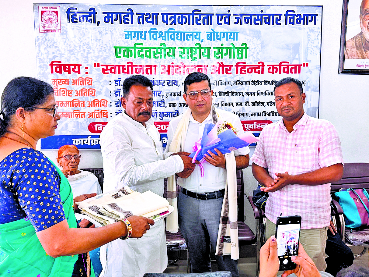 बोधगया. भारतीय स्वतंत्रता संग्राम ने ऐसे महान आदर्शों को जन्म दिया जिन्होंने न सिर्फ स्वतंत्रता सेनानियों को प्रेरित किया अपितु हिंदी कवियों की रचनाओं को भी ओजपूर्ण स्वर दिया. 1857 एक महत्वपूर्ण विभाजक रेखा है जो भारत के प्राचीन सांस्कृतिक राष्ट्रवाद को नये परिदृश्य में सामाजिक और राजनीतिक राष्ट्रवाद से जोड़ती है. भारत की सामूहिक चिंताओं को एक सूत्र में जोड़कर उसे राष्ट्रीय भूमिका सौंपती है. उक्त बातें एमयू हिंदी, मगही और पत्रकारिता विभाग द्वारा आयोजित स्वाधीनता आंदोलन और हिंदी कविता विषयक राष्ट्रीय संगोष्ठी में हरियाणा केंद्रीय विश्वविद्यालय से आये मुख्य अतिथि डॉ सिद्धार्थ शंकर राय ने कही. डॉ सिद्धार्थ ने भारतेंदु की विभिन्न कविताओं, मैथिलीशरण गुप्त की रचना भारत भारती, द्वारिका प्रसाद माहेश्वरी की कविता वीर तुम बढ़े चलो, प्रसाद की कविता हिमाद्रि तुंग शृंग और कामायनी, निराला की कविता वर दे वीणावादिनि एवं राम की शक्तिपूजा आदि के माध्यम से व्यक्त की गयी स्वाधीनता की चेतना को रेखांकित किया. हिंदी विभाग की पूर्व शिक्षिका डॉ जनकमणि कुमारी ने स्वाधीनता आंदोलन की चर्चा करते हुए हिंदी कविता में अनुस्यूत उसके विभिन्न स्वरों को रेखांकित किया. एसडी कॉलेज, परैया की शिक्षिका डॉ चंचला कुमारी की भी उपस्थिति रही. कार्यक्रम का आरंभ करते हुए हिंदी, मगही और पत्रकारिता के विभागाध्यक्ष प्रो ब्रजेश कुमार राय ने सभी अतिथियों का अंगवस्त्र एवं पुष्पगुच्छ प्रदान कर स्वागत किया व सभी अतिथियों का परिचय कराया. मंच संचालन डॉ परम प्रकाश राय ने किया. आभार ज्ञापन प्रो आनंद कुमार सिंह ने किया. इस अवसर पर हिंदी विभाग के शिक्षक प्रो सुनील कुमार, डॉ राकेश कुमार रंजन, डॉ अनुज कुमार तरुण, डॉ अम्बे कुमारी, मगही अध्येता डॉ किरण कुमारी, प्राचीन इतिहास विभाग से डॉ अनूप भारद्वाज मौजूद रहे.