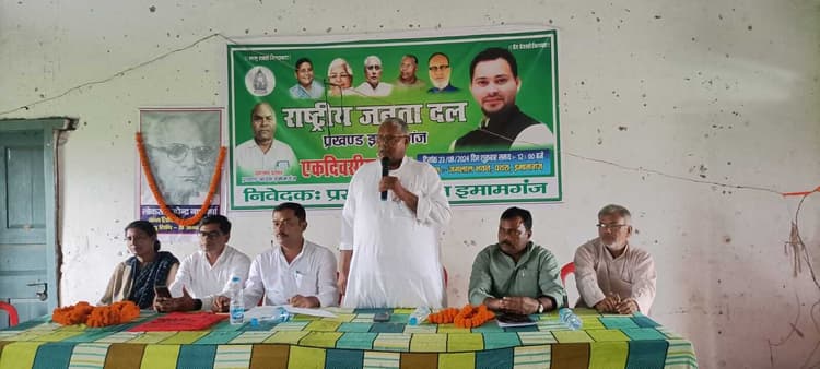 इमामगंज. प्रखंड के पथरा गांव स्थित जगलाल भवन के सभागार में शुक्रवार को राष्ट्रीय जनता दल के पंचायत अध्यक्षों की बैठक आयोजित की गयी. बैठक की अध्यक्षता राजद प्रखंड अध्यक्ष प्रह्लाद प्रसाद ने की. वहीं संचालन विराज पंचायत के पंचायत अध्यक्ष रंजीत यादव ने किया. कार्यक्रम का शुभारंभ पूर्व केंद्रीय मंत्री उपेंद्रनाथ वर्मा के छायाचित्र पर मालार्पण कर किया गया. बैठक में मुख्य अतिथि के रूप में मौजूद उदय नारायण चौधरी ने बूथ स्तर पर मजबूती प्रदान करने पर जोर दिया. उन्होंने आरक्षण के संबंध में कहा कि जो नेता आज सुप्रीम कोर्ट के फैसले को सही ठहराते हुए कह रहे हैं कि यह फैसला 10 साल पूर्व ही आना चाहिए था. उनको पहले अपना आरक्षण छोड़ना चाहिए. उन्होंने भाजपा पर निशाना लगाते हुए कहा कि आज आरक्षण को समाप्त किया जा रहा है. नौकरी का सबसे बड़ा क्षेत्र रेलवे था, जिसका निजीकरण कर दिया गया और निजीकरण में आरक्षण नहीं है. इस मौके पर जिला अध्यक्ष सुभाष यादव, जिला प्रधान महासचिव अजय प्रसाद दांगी, प्रखंड अध्यक्ष प्रह्लाद प्रसाद, अस्मिता कुमारी, बृजमोहन प्रसाद, शिव शंकर प्रसाद, दीपक रावत, जनार्दन यादव सहित कई लोगों ने कार्यक्रम को संबोधित किया.