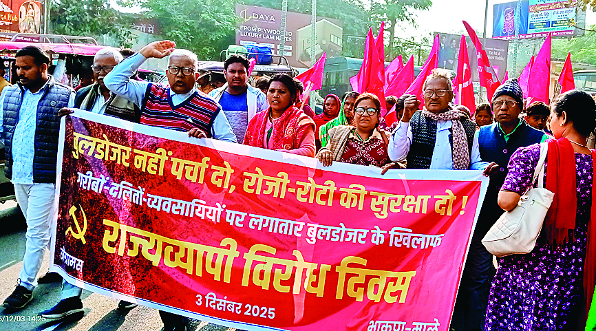 गया जी. “बुलडोजर नहीं, जमीन का पर्चा दो. रोजी-रोटी की सुरक्षा दो” नारे के साथ गरीबों, दलितों और व्यवसायियों पर लगातार चलाये जा रहे बुलडोजर अभियान के खिलाफ भाकपा माले द्वारा बुधवार को राज्यव्यापी विरोध दिवस के तहत शहर में विरोध मार्च निकाला गया. समाहरणालय स्थित आंबेडकर पार्क से शुरू हुआ जुलूस जीबी रोड होते हुए टावर चौक पहुंचा, जहां सभा का आयोजन किया गया. सभा को संबोधित करते हुए पार्टी जिला सचिव निरंजन कुमार ने कहा कि सरकार बनते ही गया सहित पूरे बिहार में अतिक्रमण के नाम पर फुटपाथी दुकानदारों को उजाड़ा जा रहा है और गरीबों को बेघर किया जा रहा है. लाखों भूमिहीन परिवारों को बिना पुनर्वास किये बेघर किया जा रहा है. सरकार को भूमिहीनों को जमीन का पर्चा और पक्का मकान देना चाहिए. उन्होंने कहा कि फुटपाथ पर अपनी आजीविका चलाने वाले हजारों दुकानदारों की रोजी-रोटी बिना वैकल्पिक व्यवस्था के छीनी जा रही है. नेताओं ने कहा कि शहर में एक भी वेंडिंग जोन का नहीं होना सरकार की आधी-अधूरी तैयारी को दर्शाता है. कार्यक्रम में जिला सचिव निरंजन कुमार, नगर प्रभारी तारिक अनवर, जिला कमेटी सदस्य रीता वर्णवाल, रामलखन प्रसाद, बच्चू सिंह, रवि कुमार, रामचंद्र प्रसाद, अंजुषा कुमारी, ईश्वर चौधरी, रामानंद सिंह, मो. शाकिब सहित कई लोग शामिल थे.