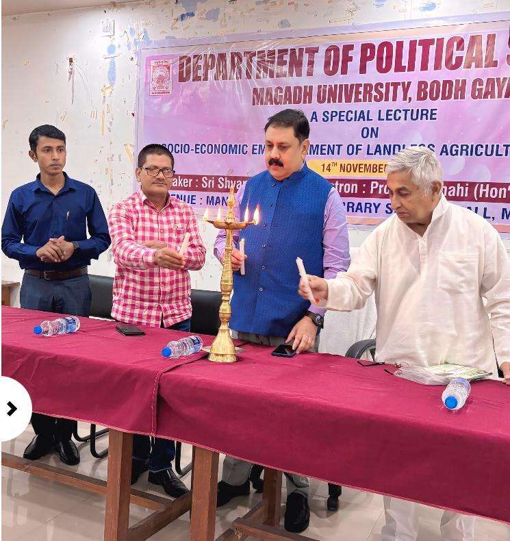 मगध विश्वविद्यालय के राजनीति विज्ञान विभाग में शुक्रवार को भूमिहीन कृषक मजदूरों के सामाजिक-आर्थिक सशक्तीकरण विषय पर विशेष व्याख्यान का आयोजन किया गया. कार्यक्रम के मुख्य वक्ता देश के ख्यातिप्राप्त सामाजिक कार्यकर्ता श्याम प्रसाद थे, जो पिछले दो दशकों से भूमिहीन किसानों के अधिकारों व कल्याण के लिए सक्रिय रूप से कार्य कर रहे हैं. उनके द्वारा लिखित एवं संपादित 30 से अधिक पुस्तकें प्रकाशित हो चुकी हैं तथा विभिन्न राष्ट्रीय-अंतरराष्ट्रीय मंचों से उन्हें सम्मान प्राप्त हो चुके हैं. कार्यक्रम का शुभारंभ कुलपति प्रो शशि प्रताप शाही ने मुख्य वक्ता श्याम प्रसाद को पुष्पगुच्छ, शॉल एवं स्मृति चिह्न भेंट कर किया. इस अवसर पर विभागाध्यक्ष डॉ अंजनी कुमार घोष, डॉ शमशाद अंसारी, डॉ श्रद्धा ऋषि, डॉ प्रियंका सिंह, डॉ दिव्या मिश्रा, प्रो अविनाश कुमार सहित विभाग के शिक्षक व शोधार्थी उपस्थित थे. अपने व्याख्यान में श्याम प्रसाद ने कहा कि देश में करोड़ों भूमिहीन कृषक मजदूर आज भी अपनी स्पष्ट पहचान और कानूनी अधिकारों से वंचित हैं. उन्होंने कहा कि इनमें बड़ी संख्या अनुसूचित जाति एवं अनुसूचित जनजाति समुदायों की है, जिन्हें सदियों पुरानी जातिगत प्रथाओं व सामाजिक भेदभाव के कारण दोहरी मार झेलनी पड़ती है. भूमिहीन मजदूरों के सामाजिक-आर्थिक सशक्तीकरण के लिए सरकार, समाज और शैक्षणिक संस्थानों को मिलकर ठोस नीतिगत कदम उठाने होंगे. व्याख्यान अत्यंत संवादात्मक रहा व छात्र-छात्राओं ने सक्रिय रूप से भाग लिया तथा अपने सवाल रखे. विक्रम कुमार, सनोज कुमार व अर्चना कुमारी ने मंच पर आकर भूमिहीन मजदूरों से जुड़े कई ज्वलंत मुद्दों को प्रभावी ढंग से प्रस्तुत किया. कार्यक्रम के अंत में प्रो अविनाश कुमार ने मुख्य वक्ता के विचारों का संक्षिप्त व सारगर्भित सारांश प्रस्तुत किया, जबकि विभागाध्यक्ष डॉ अंजनी कुमार घोष ने श्याम प्रसाद व सभी उपस्थित जनों के प्रति आभार व्यक्त किया.डिस्क्लेमर: यह प्रभात खबर समाचार पत्र की ऑटोमेटेड न्यूज फीड है. इसे प्रभात खबर डॉट कॉम की टीम ने संपादित नहीं किया है
