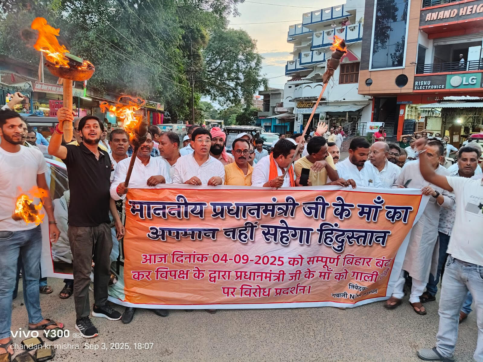 प्रधानमंत्री की मां को गाली दिये जाने के विरोध में उतरे कार्यकर्ता प्रतिनिधि, शेरघाटी. प्रधानमंत्री नरेंद्र मोदी की माता को कथित रूप से कांग्रेस नेता राहुल गांधी व राजद नेता तेजस्वी यादव के मंच से गाली दिये जाने के विरोध में बुधवार की शाम एनडीए कार्यकर्ताओं ने शेरघाटी में कैंडल मार्च निकालकर विरोध दर्ज कराया. कैंडल मार्च जेपी चौक से थाना मोड़ तक निकाला गया. कैंडल मार्च में भाजपा जिलाध्यक्ष प्रेम प्रकाश उर्फ चिंटू सिंह, जदयू प्रखंड अध्यक्ष प्रो अरविंद कुमार, पूर्व मंत्री डॉ विनोद प्रसाद यादव, जदयू महानगर अध्यक्ष राजू बरनवाल, भाजपा प्रवक्ता विनय प्रसाद, भाजपा नगर अध्यक्ष राधेश्याम सिंह, मंडल अध्यक्ष रवि कुमार सिंह, दीनानाथ पांडे, संजय सिंह समेत बड़ी संख्या में कार्यकर्ता शामिल हुए. कार्यकर्ताओं ने कहा कि देश के प्रधानमंत्री की मां को सार्वजनिक मंच से अपमानित करना लोकतांत्रिक मर्यादा का उल्लंघन है और यह कृत्य अत्यंत निंदनीय है. उन्होंने आरोप लगाया कि कांग्रेस और राजद के शीर्ष नेताओं की मौजूदगी में मंच से इस प्रकार की अभद्र टिप्पणी करना न केवल प्रधानमंत्री, बल्कि पूरे देश की माताओं का अपमान है. नेताओं ने मांग की कि राहुल गांधी और तेजस्वी यादव को देश की सभी माताओं से सार्वजनिक रूप से माफी मांगनी चाहिए. एनडीए कार्यकर्ताओं ने चेतावनी दी कि अगर माफी नहीं मांगी गयी, तो आंदोलन को और तेज किया जायेगा. मौके पर नेताओं ने जानकारी दी कि गुरुवार को भारत बंद का आह्वान किया गया है और जीटी रोड पर चक्का जाम कर विरोध जताया जायेगा. कार्यकर्ताओं ने सरकार और प्रशासन से मांग की है कि इस अपमानजनक बयानबाजी पर संज्ञान लेकर उचित कार्रवाई की जाये.