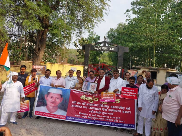 गया. शहीद बैकुंठ शुक्ल के शहादत दिवस पर शहादत दिवस समारोह समिति के तत्वावधान में केंद्रीय कारा से पदयात्रा निकाली जो कई प्रमुख मार्गों से होते हुए चाणक्यपुरी स्थित शहीद बैकुंठ शुक्ल पार्क पहुंचकर सभा में तब्दील हो गयी. सभा की अध्यक्षता सीपीआई के वरिष्ठ नेता अधिवक्ता मसूद मंजर व संचालन रंजीत कुमार ने किया. सभा को संबोधित करते हुए वक्ताओं ने कहा कि ब्रिटिश हुकूमत के दौरान हुए सेंट्रल एसेंबली बम कांड को अंजाम देने वाले भगत सिंह, राजगुरु व सुखदेव की फांसी की सजा में इकबालिया गवाह बने बिहार के बेतिया निवासी फणीनद्र नाथ घोष को मौत के नींद सुलाने वाले वैशाली जिले के जलालपुर गांव निवासी बैकुंठ शुक्ल को ब्रिटिश हुकूमत ने 14 मई 1934 को फांसी दी थी. शुक्ल व इनकी पत्नी वीरांगना राधिका देवी दोनों में बचपन से ही देश को आजादी दिलाने का जुनून था. दोनों 1931 में मुजफ्फरपुर के तिलक मैदान में तिरंगा झंडा फहराने में ब्रिटिश हुकूमत द्वारा गिरफ्तार किये गये थे. केंद्रीय कारा का नामकरण शहीद बैकुंठ शुक्ल के नाम पर कराने के लिए वर्षों से मांग की जा रही है. बैकुंठ शुक्ल के नाम पर बने पार्क में शहीद बैकुंठ शुक्ल व वीरांगना राधिका देवी की प्रतिमा लगाने की भी मांग की जा रही है. इन नेताओं ने कहा कि इन मांगों की पूर्ति के लिए आंदोलन और भी तेज किया जायेगा. कार्यक्रम को गया नगर निगम की उपमहापौर चिंता देवी, पूर्व मंत्री अवधेश कुमार सिंह, विजय कुमार मिट्ठू, पूर्व वार्ड पार्षद लालजी प्रसाद, बीआईटी के निदेशक अवधेश कुमार शर्मा, महेश शर्मा, इकबाल हुसैन, वार्ड पार्षद गजेंद्र सिंह, परवेज आलम, जीबीएम कॉलेज की पूर्व प्राचार्या डॉ शांति सिंह, रिंकू देवी, कपिलदेव सिंह, रविन्द्र शर्मा, टिंकू गिरी, मो याहीया, मुरारी शर्मा, बाबूलाल प्रसाद सिंह, विपिन बिहारी सिन्हा, सूदन सिंह, दामोदर गोस्वामी, अरविंद कुमार सिन्हा, गोपाल पटवा, राधे कांत शर्मा, शंभू सिंह ने भी संबोधित किया.