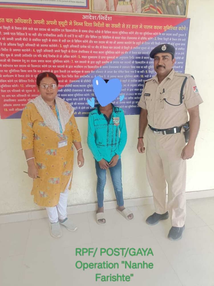 गया. आरपीएफ की टीम ने शुक्रवार को गया रेलवे स्टेशन परिसर से एक बच्ची और बच्चे को बरामद कर उनके परिजनों से मिलाया. इस संबंध में आरपीएफ इंस्पेक्टर बनारसी यादव ने बताया कि चेकिंग अभियान के दौरान एक नाबालिग बच्ची व बच्चे को देखा गया. अकेले डरा व सहमा अवस्था में पाया गया. दोनों बच्चों को सहज महसूस कराते हुए पोस्ट पर लाया गया. रेलवे चाइल्ड हेल्प डेस्क गया (जिला बाल संरक्षण इकाई) की महिला स्टाफ सुरभि कुमारी पोस्ट पर उपस्थित हुईं, उचित कागजी कार्रवाई के बाद दोनों बच्चों को सुपुर्द किया गया. इसमें बच्ची किशनगंज व बच्चा नवादा का रहनेवाला है.