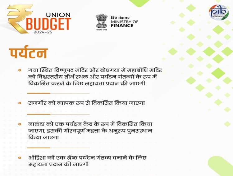 Union Budget 2024-25 tourism केंद्रीय वित्त मंत्री निर्मला सीतारमण ने मंगलवार को बिहार के विश्व प्रसिद्ध धार्मिक-पर्यटन केंद्रों गया के विष्णुपद मंदिर और बोधगया के महाबोधि मंदिर को काशी विश्वनाथ की तर्ज पर कॉरिडोर में विकसित करने का ऐलान किया है. बजट 2024-25 पेश करते हुए उन्होंने ये बात कही. इसके साथ ही उन्होंने आगे कहा कि राजगीर, नालंदा को वैश्विक पर्यटन के केंद्रबिंदु के तौर पर विकसित किया जायेगा. केंद्र सरकार इसपर विशेष ध्यान देगी.