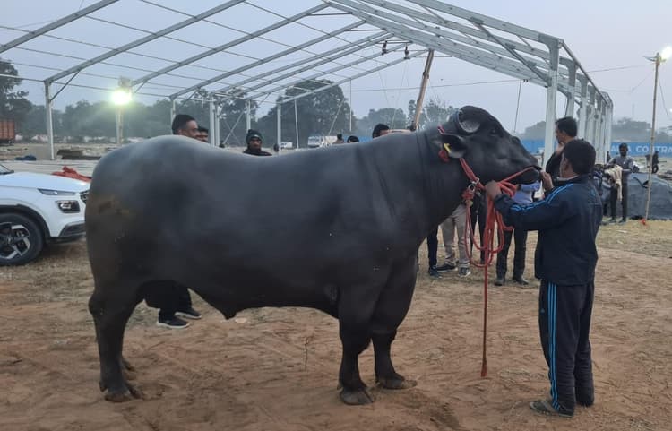 पटना. बिहार में आयोजित सोनपुर मेले में तो तरह-तरह के पशु आये हुए हैं, लेकिन पटना के वेटनरी कॉलेज ग्राउंड में आजकल मुर्रा नस्ल के भैसें गोलू को देखने के लिए किसानों और पशुपालकों की भीड़ उमड़ पड़ी है. मंगलवार को यह अपने मालिक हरियाणा के नरेंद्र सिंह के साथ यहां पहुंचा है और 23 दिसंबर तक यहां रहेगा. नरेंद्र सिंह अपने भैंसे को घोल्लू बुलाते हैं. इस गोलू-2 उर्फ घोल्लू की कीमत 10 करोड़ आंकी गयी है. करीब छह साल के भैंसे गोलू-2 नरेंद्र सिंह के घर तीसरी पीढ़ी है. नरेंद्र कहते हैं कि इसके दादा पहली पीढ़ी थे जिसका नाम गोलू था. उसका बेटा बीसी 448 को गोलू-1 कह सकते हैं. यह गोलू का पोता है. नरेंद्र बताते हैं कि गोलू-2 का सीमेन बेचकर वो एक साल में 25 लाख रुपये कमा लेते हैं. नरेंद्र का दावा है कि गोलू-2 इनके इशारे समझता है.