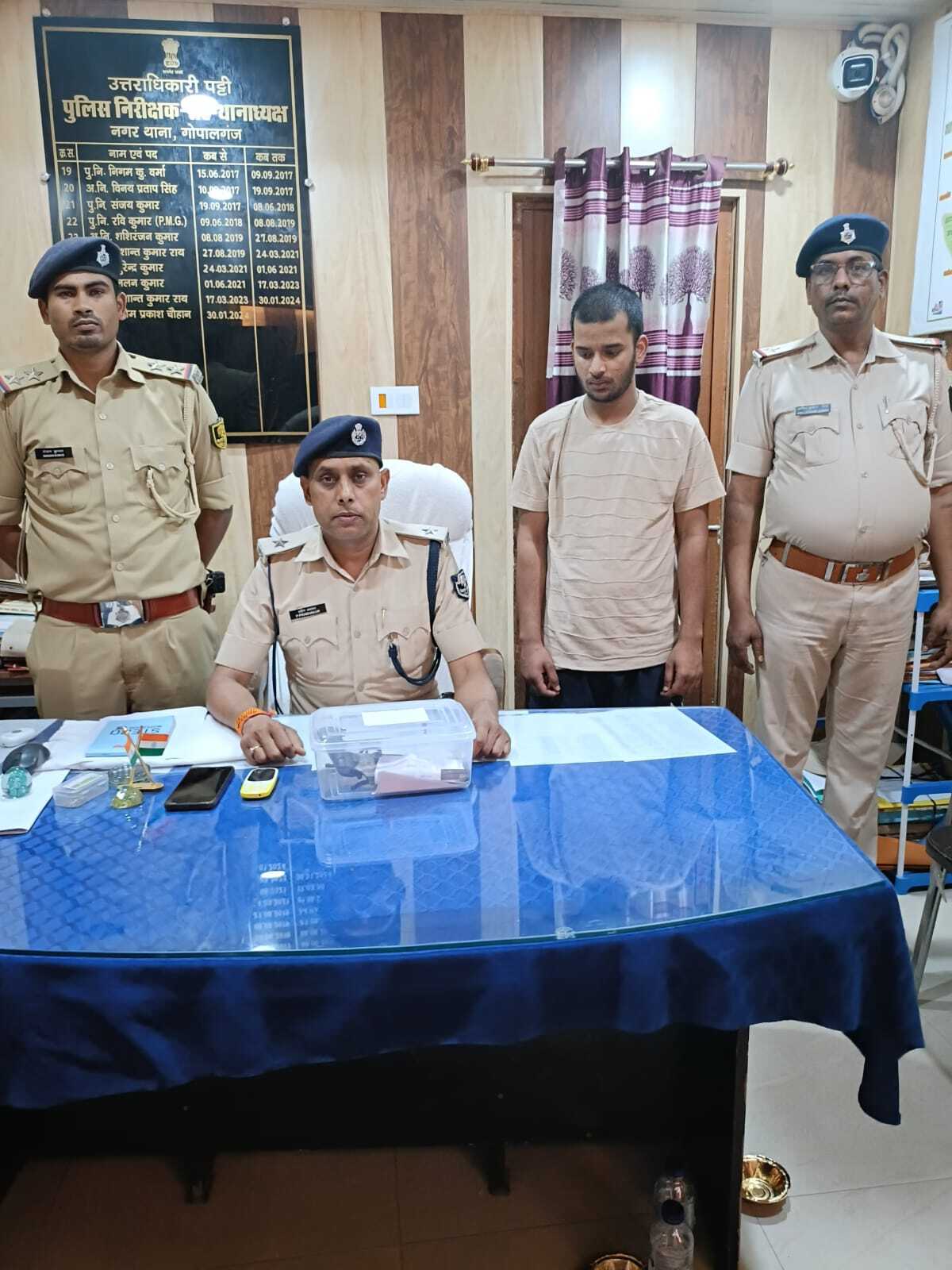 गोपालगंज. नगर थाने की पुलिस ने गुप्त सूचना के आधार पर छापेमारी कर एक युवक को एक कट्टा व पांच कारतूस के साथ बरामद किया. आरोपित युवक की पहचान बंजारी गांव के निवासी स्व. राजकिशोर यादव के पुत्र प्रियांशु यादव के रूप में हुई है. जानकारी के अनुसार नगर थाने की पुलिस को गुप्त सूचना मिली थी कि प्रियांशु यादव एक अवैध हथियार रखा हुआ है. प्राप्त सूचना के आधार पर पुलिस ने तत्काल टीम का गठन किया. गठित टीम मौके पर पहुंची और घेराबंदी करते हुए आरोपित युवक को गिरफ्तार कर लिया. नगर थानाध्यक्ष प्रवीण कुमार प्रभाकर ने बताया कि जांच में यह पता लगाया जा रहा है कि आरोपित को यह हथियार कहां से मिला और वह इसका इस्तेमाल किस काम में करने वाला था.