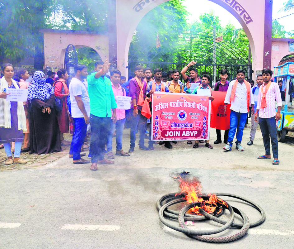 गोपालगंज. जयप्रकाश विश्वविद्यालय में स्नातक सत्र 2020-23 के पार्ट टू के मार्कशीट पर भारी पैमाने पर गड़बड़ी को लेकर छात्रों का गुस्सा शुक्रवार को फूट पड़ा. अखिल भारतीय विद्यार्थी परिषद के बैनर तले सैकड़ों छात्र- छात्राओं ने विश्वविद्यालय प्रशासन के खिलाफ नारेबाजी करते हुए कमला राय कॉलेज के गेट पर ताला लगा दिया. इसके गेट पर टायर जलाकर जमकर प्रदर्शन किया. कॉलेज के प्राचार्य प्रो. एके पांडेय के समझाने के बाद छात्र शांत हुए. प्राचार्य ने रिजल्ट में जल्द सुधार कराने का आश्वासन दिया. इसके बाद छात्रों ने विभिन्न मांगों का एक ज्ञापन प्राचार्य को दिया. इसके बाद प्रदर्शन समाप्त हुआ. आंदोलन का नेतृत्व कर रहे विभाग संयोजक अनीश कुमार और जिला सह संयोजक मंजीत राय ने कहा कि पार्ट टू की मार्कशीट में जल्द से जल्द सुधार नहीं हुआ, तो इससे भी बड़ा आंदोलन होगा. साथ यह भी ध्यान रहे कि सत्र 2018-21 और 2019-22 के छात्रों का पार्ट वन और पार्ट टू अब क्लियर हुआ है, इन छात्रों को भी मौका मिलना चाहिए. वहीं महेंद्र महिला कॉलेज की मंत्री शालिनी कुमारी ने कहा कि महेंद्र महिला कॉलेज में गृह विज्ञान को छोड़ अन्य विषयों का अंक पत्र नहीं आया है. प्रदर्शन करने के दौरान अभाविप के नगर मंत्री रोहित जायसवाल, नगर कार्यकारिणी सदस्य सूरज कुमार चंदन, कॉलेज अध्यक्ष अभिषेक सिंह, उपाध्यक्ष विक्की कुशवाहा, रवि चौहान, कॉलेज सह मंत्री तेजस्वी कुशवाहा, अभिषेक पांडेय, पंकज चौरसिया, आफरीन रजी, नसीमा परवीन, निहाल पटेल, आशीष पटेल, राहुल कुमार के साथ कॉलेज इकाई और नगर इकाई के सभी कार्यकर्ता मौजूद रहे. बीते दिसंबर माह में जेपीयू ने पार्ट टू का रिजल्ट ऑनलाइन जारी किया. जारी रिजल्ट में अधिकतर छात्रों के अंकपत्र में 00 मार्क्स, अनुपस्थित या प्रैक्टिकल में 00 मार्क्स था. इसके बाद अभाविप ने आंदोलन किया, तो विवि प्रशासन ने आश्वासन दिया था कॉलेज में मार्कशीट सुधार कर भेजा जायेगा, लेकिन जब कॉलेज में जब मार्कशीट आयी, तो स्थिति पहले जैसे ही थी. इधर इस सत्र के फाइनल इयर का परीक्षा फॉर्म भरने की तिथि जारी कर दी गयी, इसको लेकर छात्र आक्राेशित हो गये.