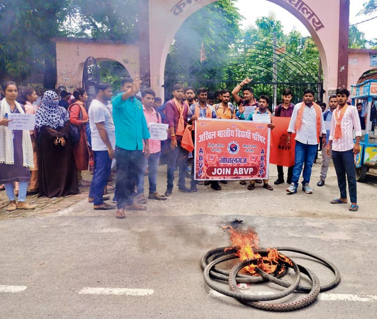 गोपालगंज. जयप्रकाश विश्वविद्यालय में स्नातक सत्र 2020-23 के पार्ट टू के मार्कशीट पर भारी पैमाने पर गड़बड़ी को लेकर छात्रों का गुस्सा शुक्रवार को फूट पड़ा. अखिल भारतीय विद्यार्थी परिषद के बैनर तले सैकड़ों छात्र- छात्राओं ने विश्वविद्यालय प्रशासन के खिलाफ नारेबाजी करते हुए कमला राय कॉलेज के गेट पर ताला लगा दिया. इसके गेट पर टायर जलाकर जमकर प्रदर्शन किया. कॉलेज के प्राचार्य प्रो. एके पांडेय के समझाने के बाद छात्र शांत हुए. प्राचार्य ने रिजल्ट में जल्द सुधार कराने का आश्वासन दिया. इसके बाद छात्रों ने विभिन्न मांगों का एक ज्ञापन प्राचार्य को दिया. इसके बाद प्रदर्शन समाप्त हुआ. आंदोलन का नेतृत्व कर रहे विभाग संयोजक अनीश कुमार और जिला सह संयोजक मंजीत राय ने कहा कि पार्ट टू की मार्कशीट में जल्द से जल्द सुधार नहीं हुआ, तो इससे भी बड़ा आंदोलन होगा. साथ यह भी ध्यान रहे कि सत्र 2018-21 और 2019-22 के छात्रों का पार्ट वन और पार्ट टू अब क्लियर हुआ है, इन छात्रों को भी मौका मिलना चाहिए. वहीं महेंद्र महिला कॉलेज की मंत्री शालिनी कुमारी ने कहा कि महेंद्र महिला कॉलेज में गृह विज्ञान को छोड़ अन्य विषयों का अंक पत्र नहीं आया है. प्रदर्शन करने के दौरान अभाविप के नगर मंत्री रोहित जायसवाल, नगर कार्यकारिणी सदस्य सूरज कुमार चंदन, कॉलेज अध्यक्ष अभिषेक सिंह, उपाध्यक्ष विक्की कुशवाहा, रवि चौहान, कॉलेज सह मंत्री तेजस्वी कुशवाहा, अभिषेक पांडेय, पंकज चौरसिया, आफरीन रजी, नसीमा परवीन, निहाल पटेल, आशीष पटेल, राहुल कुमार के साथ कॉलेज इकाई और नगर इकाई के सभी कार्यकर्ता मौजूद रहे. बीते दिसंबर माह में जेपीयू ने पार्ट टू का रिजल्ट ऑनलाइन जारी किया. जारी रिजल्ट में अधिकतर छात्रों के अंकपत्र में 00 मार्क्स, अनुपस्थित या प्रैक्टिकल में 00 मार्क्स था. इसके बाद अभाविप ने आंदोलन किया, तो विवि प्रशासन ने आश्वासन दिया था कॉलेज में मार्कशीट सुधार कर भेजा जायेगा, लेकिन जब कॉलेज में जब मार्कशीट आयी, तो स्थिति पहले जैसे ही थी. इधर इस सत्र के फाइनल इयर का परीक्षा फॉर्म भरने की तिथि जारी कर दी गयी, इसको लेकर छात्र आक्राेशित हो गये.