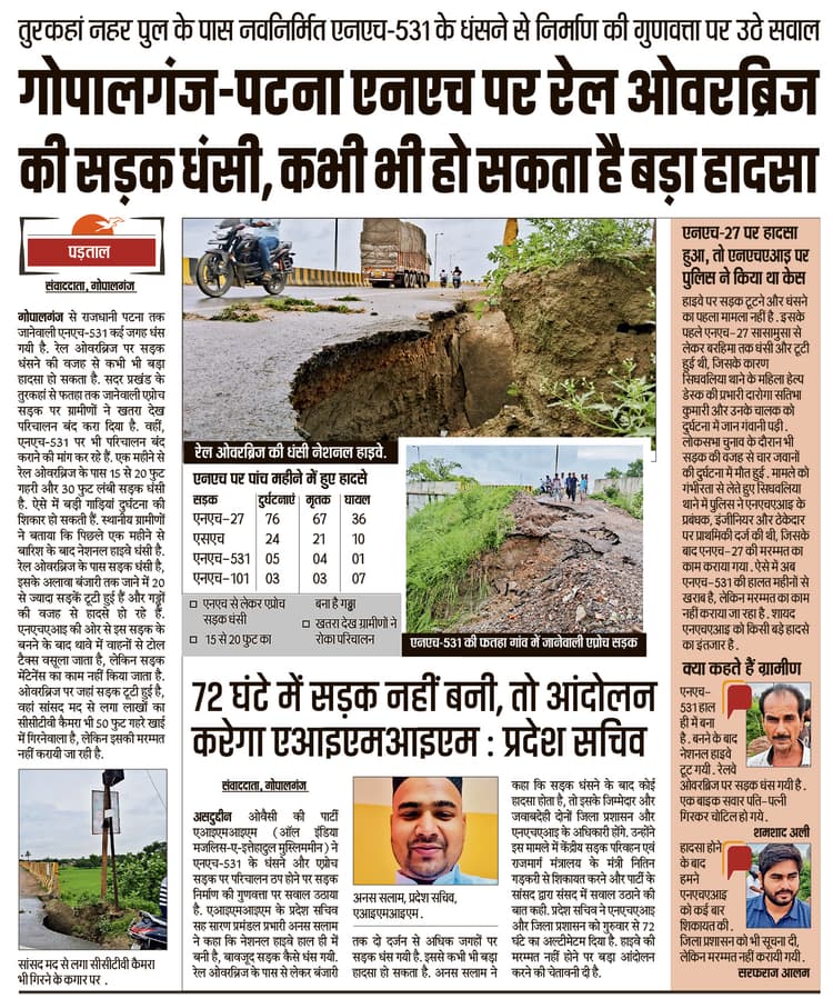 गोपालगंज. गोपालगंज-पटना को जोड़नेवाली एनएच-531 की सड़क धंसने की खबर को डीएम मोहम्मद मकसूद आलम ने गंभीरता से लिया है. डीएम ने एनएचएआइ और सड़क कंस्ट्रक्शन कंपनी को तत्काल एनएच के गड्ढों को भरने को कहा है. गुरुवार को डीएम ने कहा कि बारिश के बाद सड़क टूट गयी है. प्रभात खबर में समाचार प्रकाशित होने के बाद मामला संज्ञान में आया. अभियंताओं को दो दिनों के अंदर सड़क मरम्मत का काम चालू कराकर पूरा करने का निर्देश दिया गया है. बता दें कि बंजारी मोड़ से एनएच-27 से निकलकर थावे, मीरगंज, सीवान से होकर पटना को जानेवाली एनएच-531 सड़क पिछले साल ही बनी थी. सड़क बनने के बाद सदर प्रखंड के तुरकहा के पास रेल ओवरब्रिज के पास धंस गयी. 20 से 30 फुट का गहरा गड्ढा होने की वजह से बड़ी गाड़ियां दुर्घटना की शिकार हो सकती थीं. ग्रामीणों ने एनएचएआइ और जिला प्रशासन के अफसरों से इसकी शिकायत की, लेकिन किसी ने ध्यान नहीं दिया था. वहीं प्रभात खबर ने इस मुद्दे को गंभीरता से लिया और 22 अगस्त के अंक में खबर को प्रमुखता से प्रकाशित किया था. खबर प्रकाशित होने के बाद डीएम ने संज्ञान लिया और सड़क की हालत पर चिंता जताते हुए विभागीय अधिकारियों को तत्काल दुरुस्त करने का निर्देश दिया. डीएम के आदेश के बाद गुरुवार को टूटी हुई सड़क को चारों तरफ से घेराबंदी कर शनिवार से काम शुरू कराने के लिए कार्रवाई तेज कर दी है. तुरकहा गांव के पास गड्ढा भरने के साथ ही एनएच से जुड़ी एप्रोच सड़क को भी बनाया जायेगा, ताकि फतहा व तकिया गांव में जानेवाली ग्रामीणों को परेशानी का सामना नहीं करना पड़े. एनएच-531 कई जगहों पर धंसने के साथ ही एप्रोच सड़क भी पूरी तरह से बारिश के बाद टूट गयी है और जानलेवा बन गयी है. नेशनल हाइवे की मरम्मत होने के बाद से लोगों की परेशानी दूर हो जायेगी. हाइवे पर बारिश के बाद पानी भी कई जगहों पर जमा हो जा रहा है. खासकर ओवरब्रिज पर, ऐसे में डीएम ने सभी गड्ढों को भरने के साथ ही ओवरब्रिज पर साफ-सफाई कराने के निर्देश दिये हैं ताकि लोगों की परेशानी दूर हो सके.